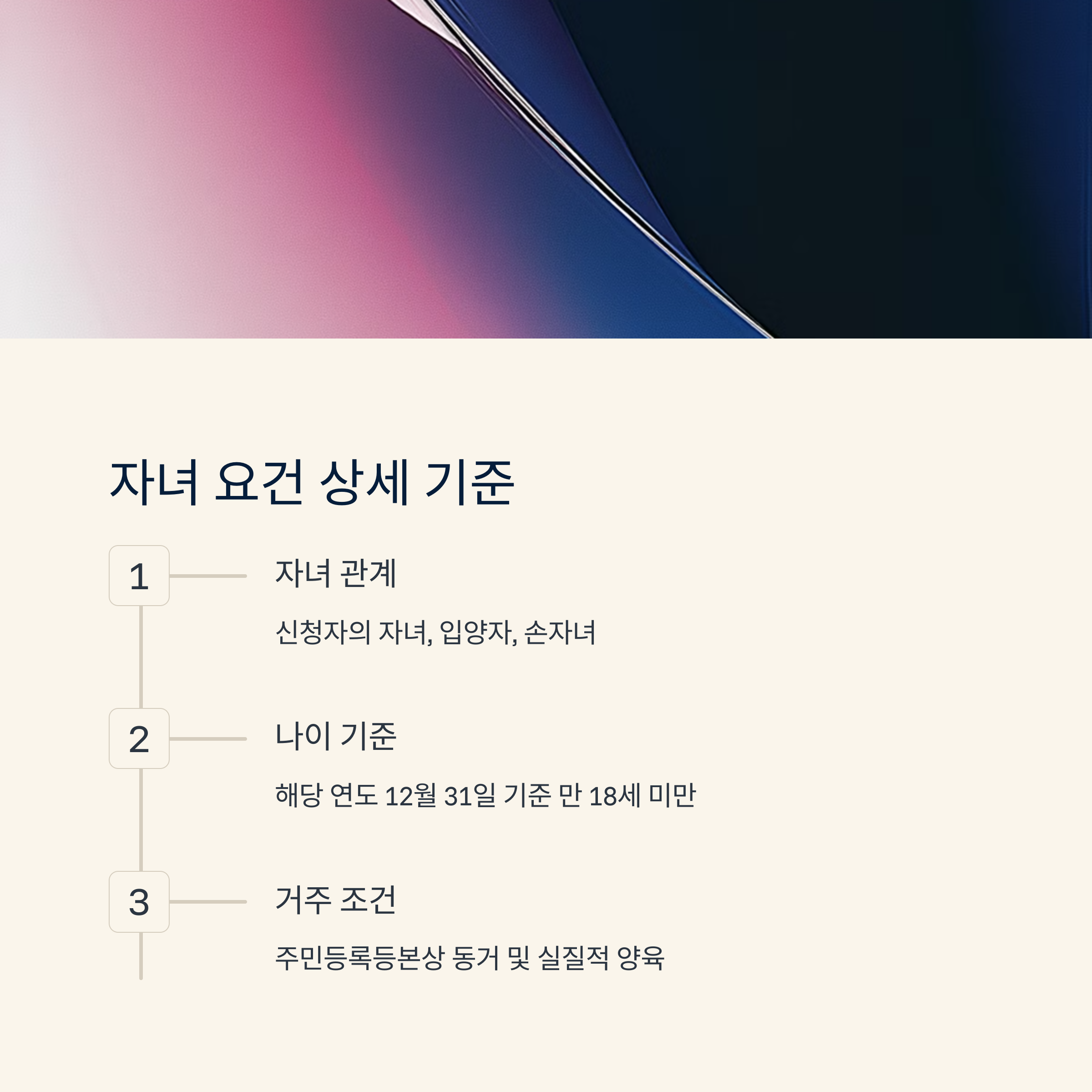 ③ 자녀요건 – 기본적으로 만 18세 미만 자녀가 있어야 하고, 주민등록상 같은 세대여야 하며 부양사실도 인정돼야 해요.