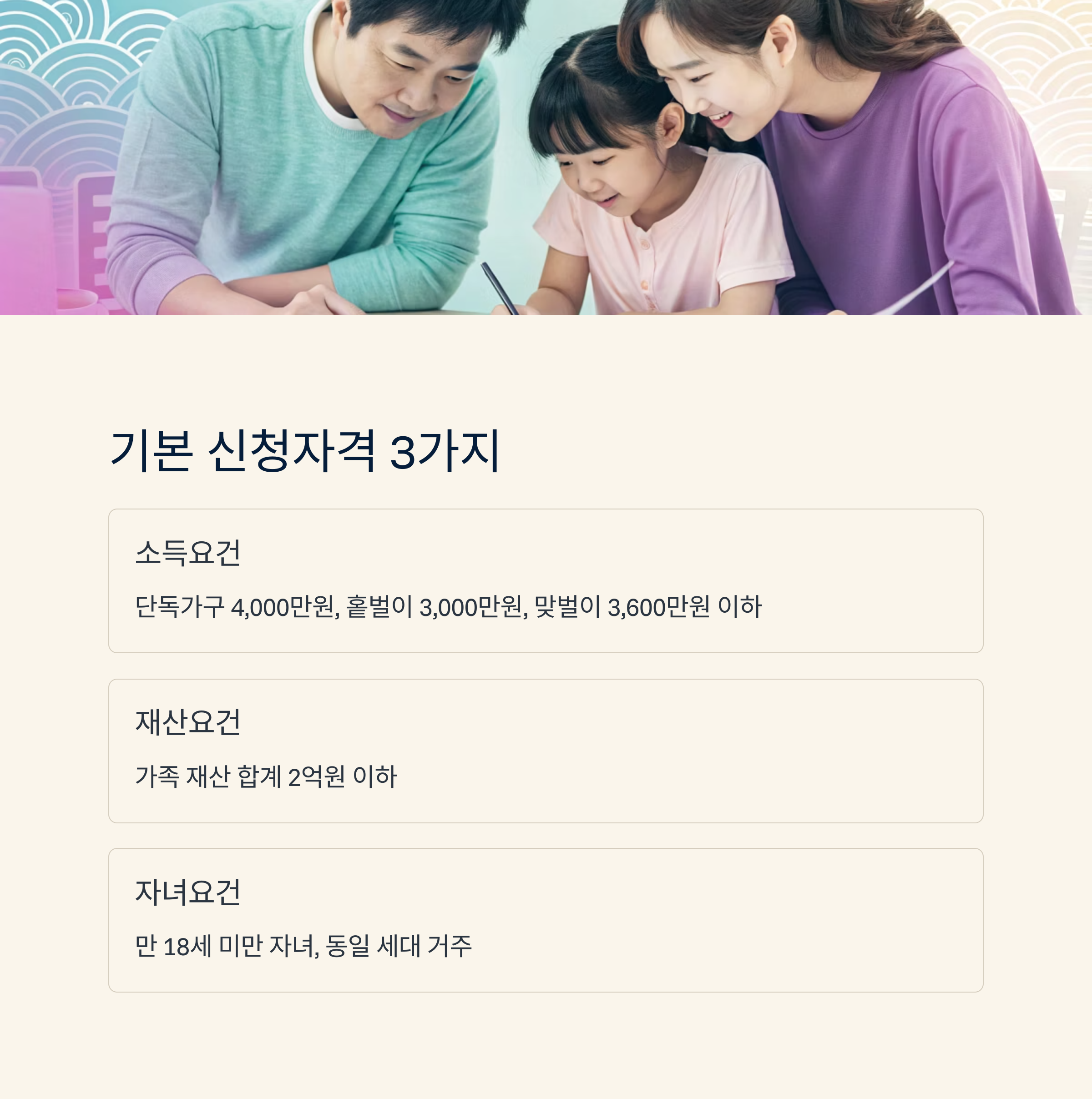 ① 소득요건 – 단독가구, 홑벌이, 맞벌이 여부에 따라 기준 금액이 달라요. 2024년 귀속 기준으로 단독가구는 약 4,000만 원 이하, 홑벌이 가구는 3,000만 원 이하, 맞벌이 가구는 3,600만 원 이하예요.