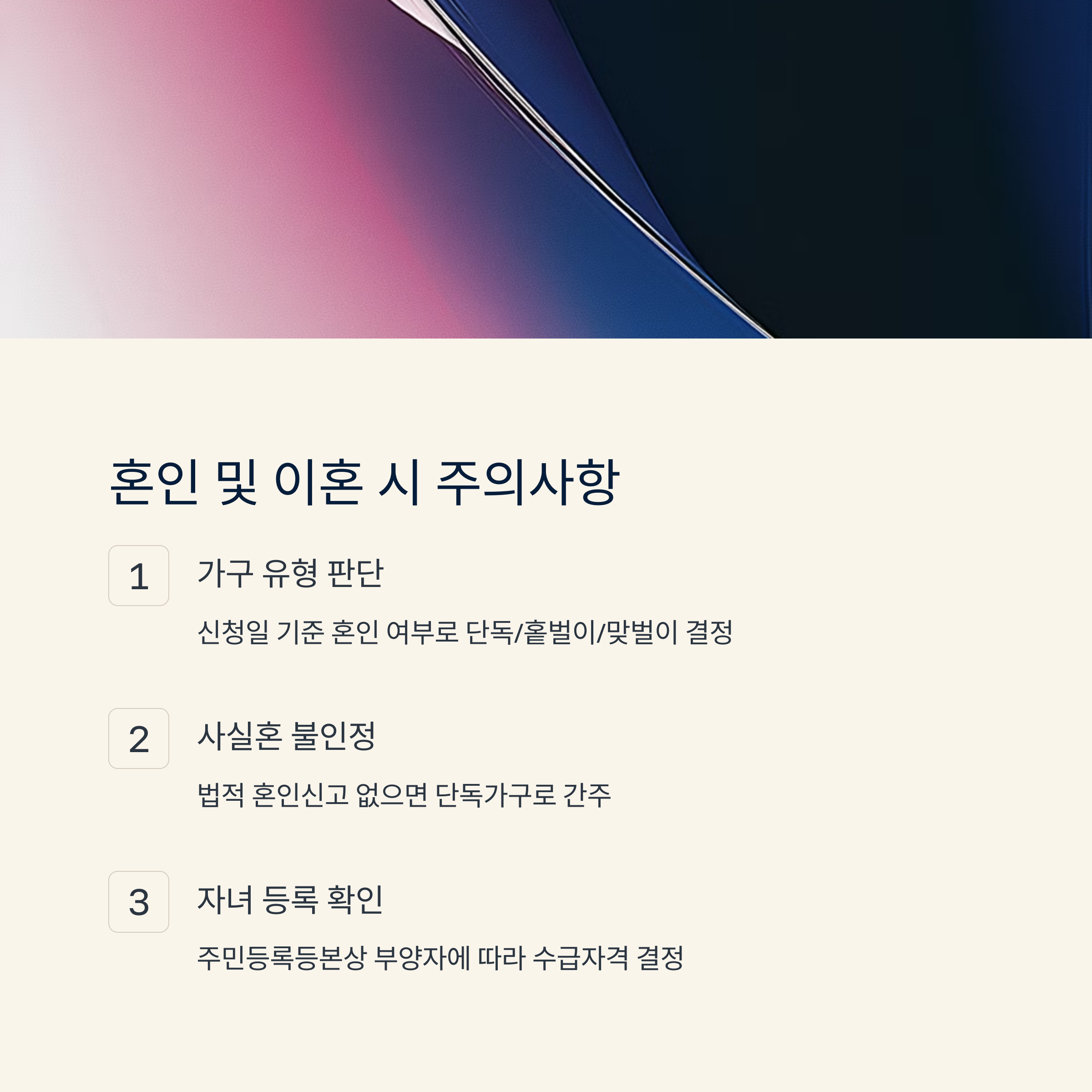혼인, 이혼 여부는 자녀장려금 수급 자격에 큰 영향을 줘요. 신청일 기준 혼인 여부를 기준으로 단독, 홑벌이, 맞벌이 가구를 판단해요. 예를 들어 이혼한 상태라면 단독가구로 간주되고, 자녀가 함께 있는지 여부가 추가적으로 판단돼요.