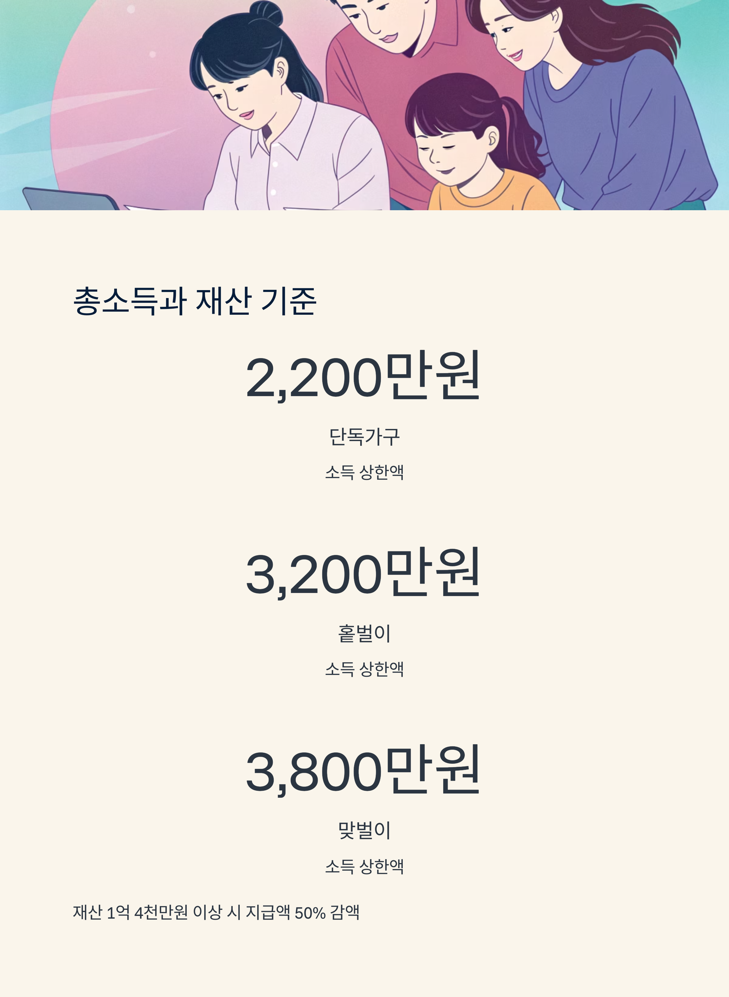 재산이 1억 4천만 원 이상일 경우 지급액이 50% 감액돼요. 그래서 애매하게 재산이 많은 경우 오히려 혜택이 줄어드는 구조가 되는 셈이죠.