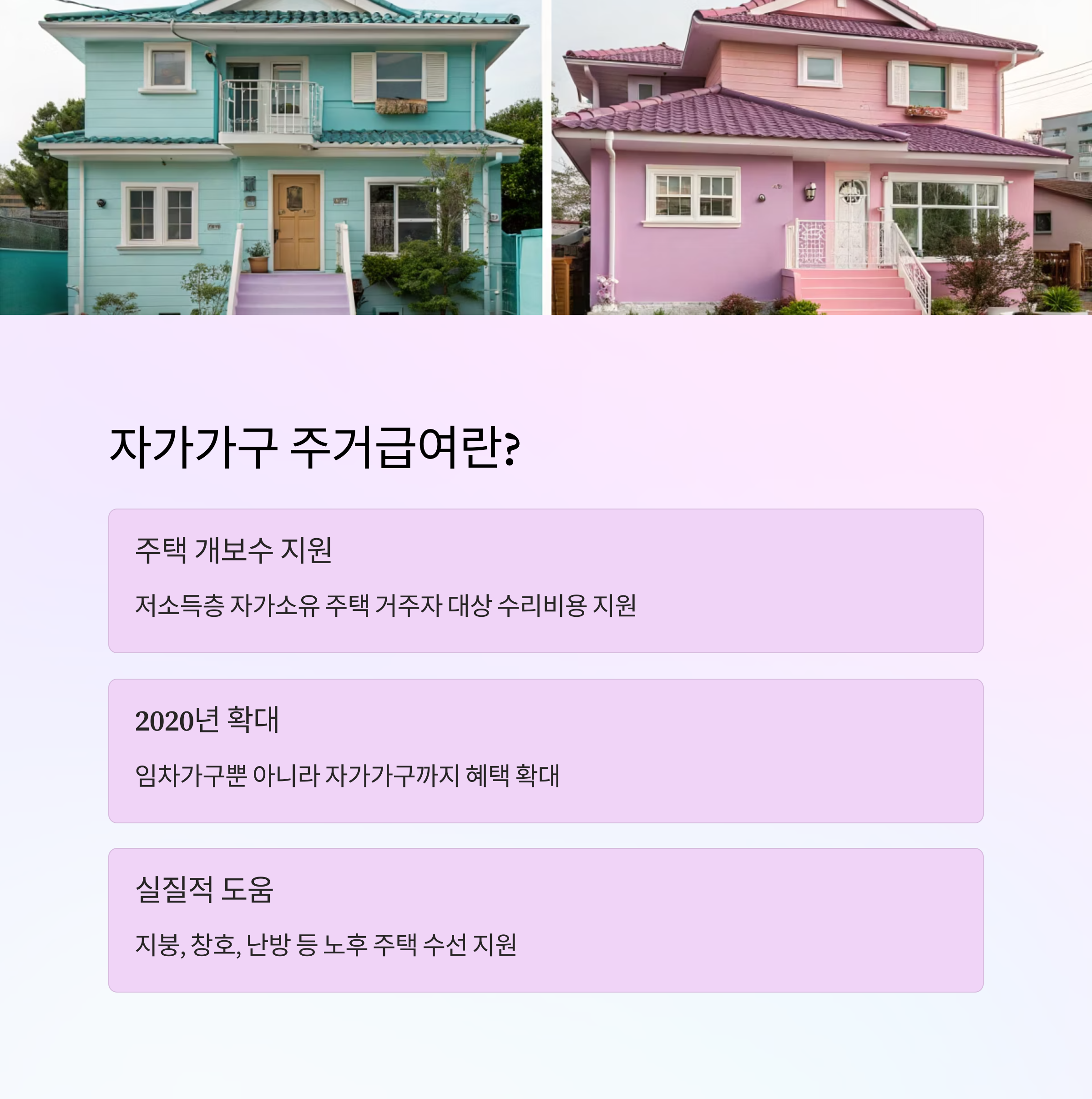 자가가구 주거급여는 '자가소유 주택에 거주하고 있는 저소득층 가구'를 대상으로 주택 개보수 비용을 정부에서 지원해주는 제도예요. 단순히 임대료를 지원하는 게 아니라, 집을 더 안전하고 쾌적하게 만들 수 있도록 실질적인 수리 비용을 보조해줘요.