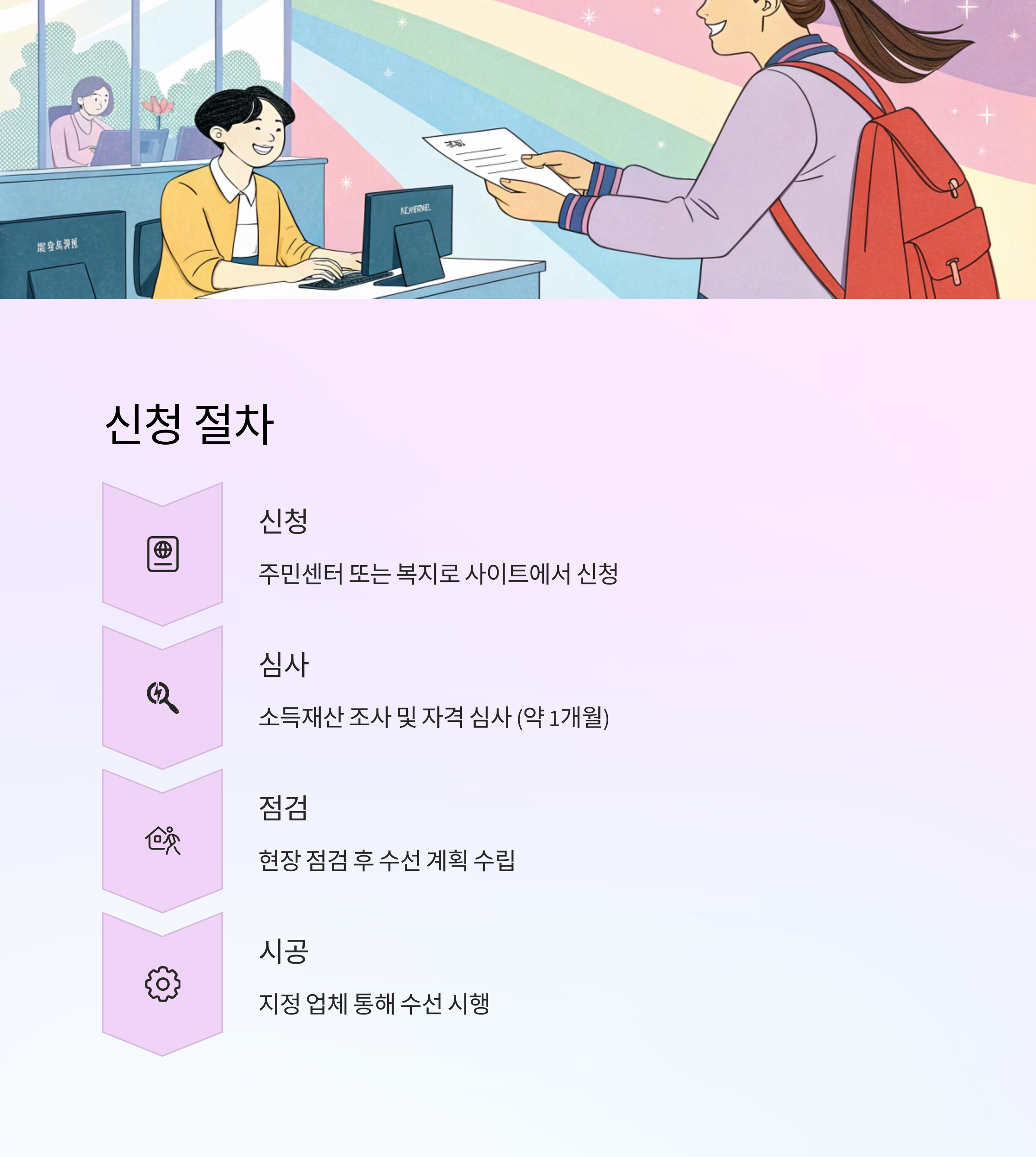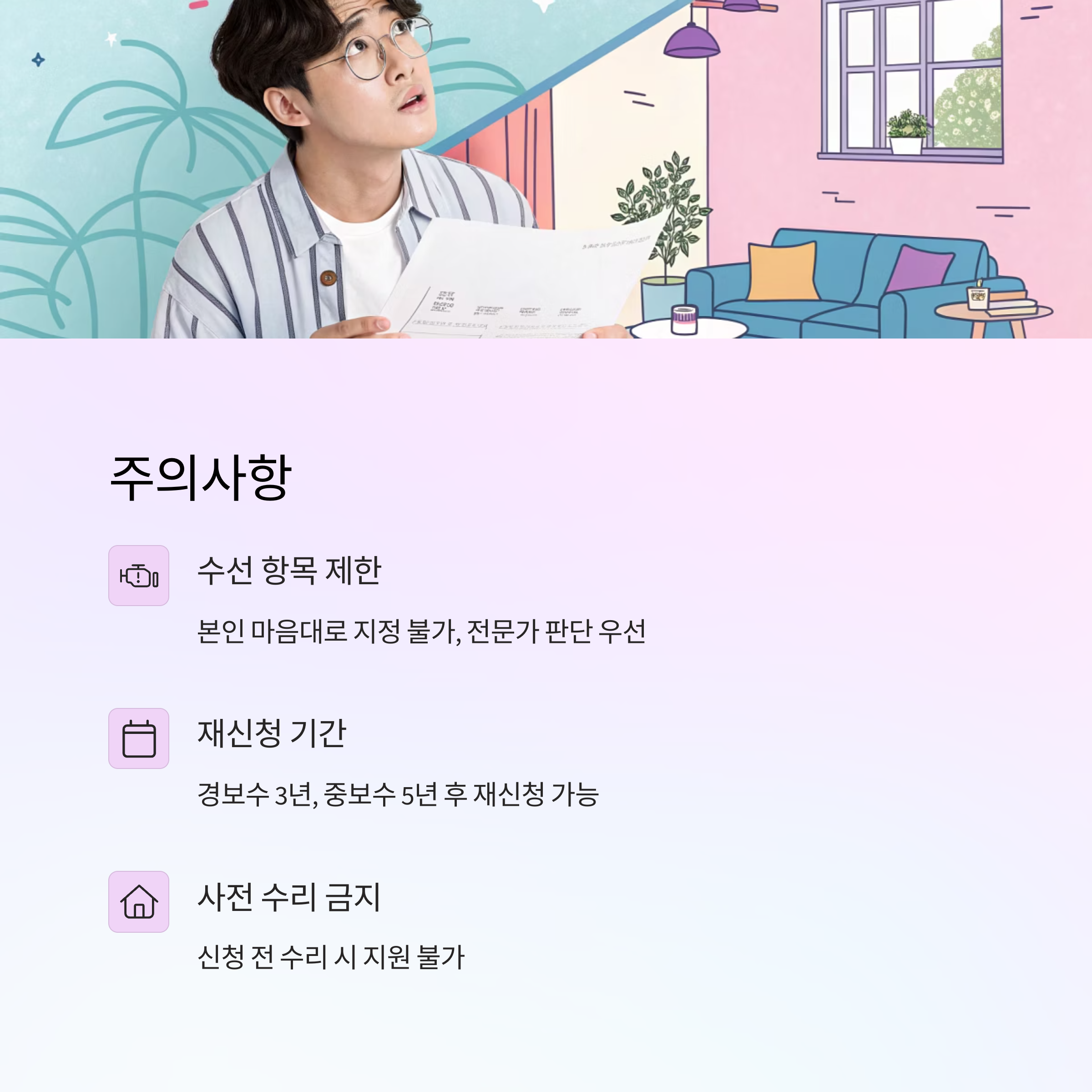 두 번째로, 수선 후 3년이 지나야 다시 신청이 가능하다는 점이에요. 경보수는 3년, 중보수는 5년 기준이기 때문에 한 번 수선하면 일정 기간 동안 다시 보조받는 건 어렵다고 보면 돼요.
