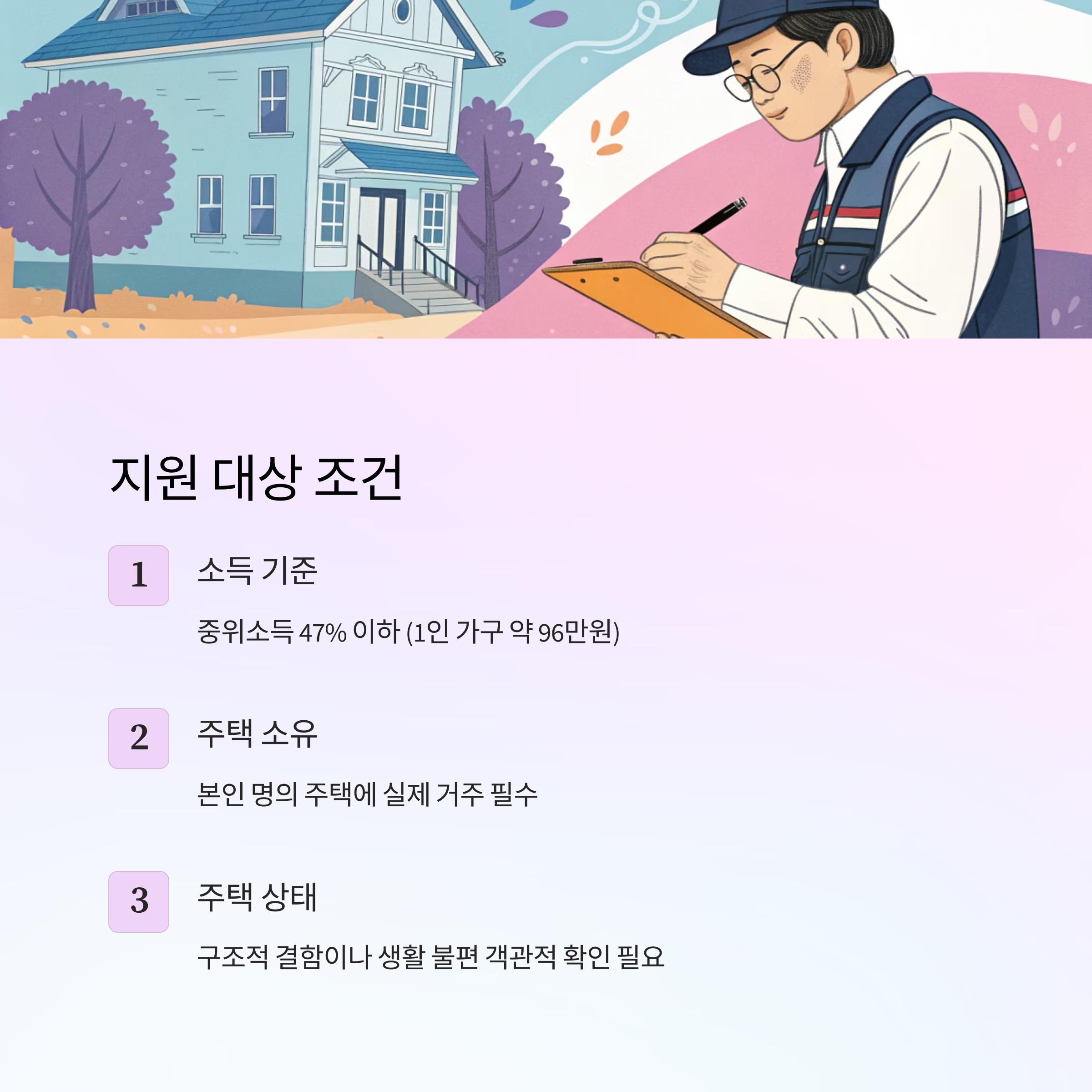 간단히 말하면, 내 집이 낡았고 소득이 일정 기준 이하이면 신청 가능성이 높다고 보면 돼요. 하지만 지역에 따라 지자체 판단도 개입되기 때문에, 실제 신청 전에 꼭 관할 주민센터나 복지로 홈페이지에서 확인해보는 게 좋아요.