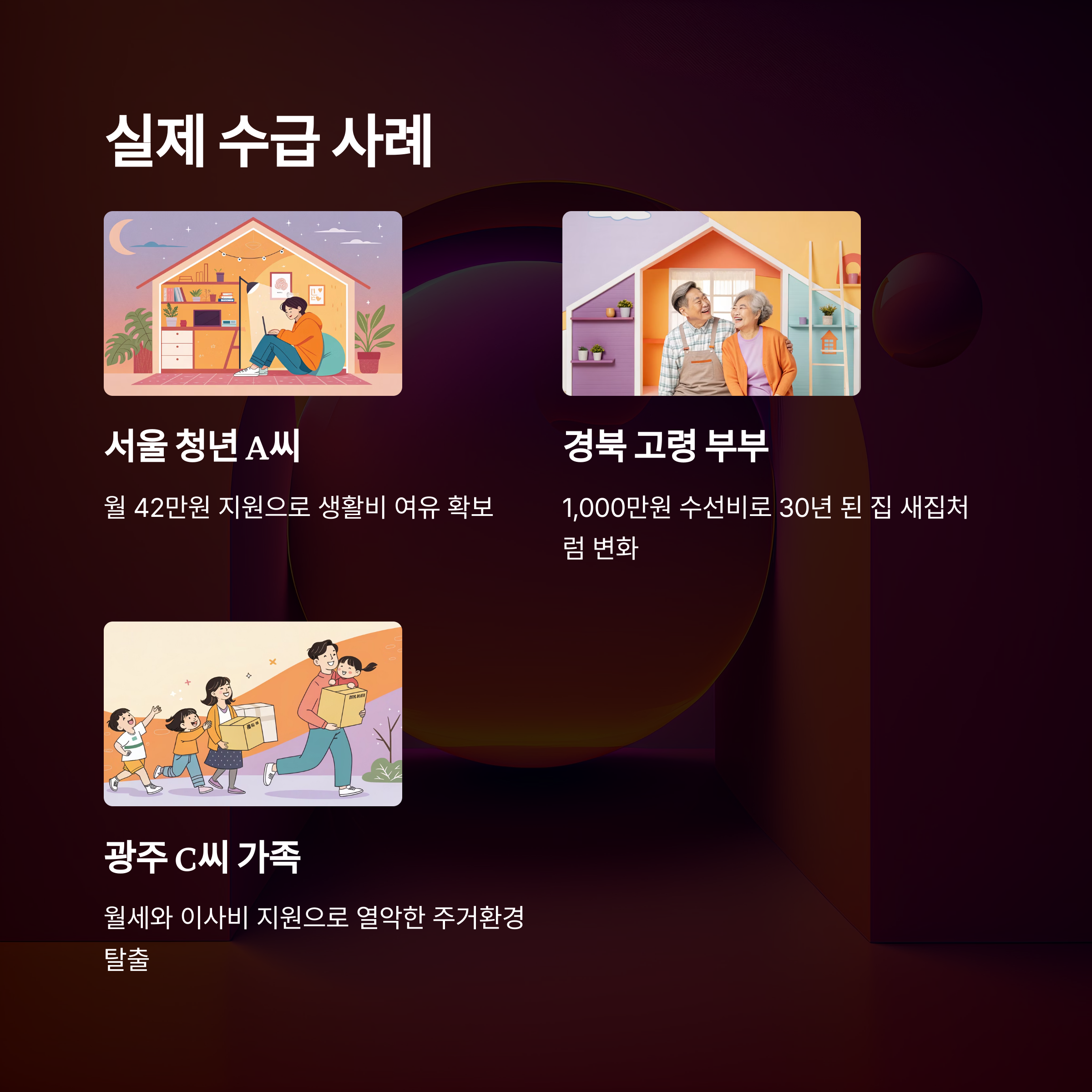 | C씨 가족 | 광주 | 월세+이사비 지원 | 열악한 주거지 탈출 |