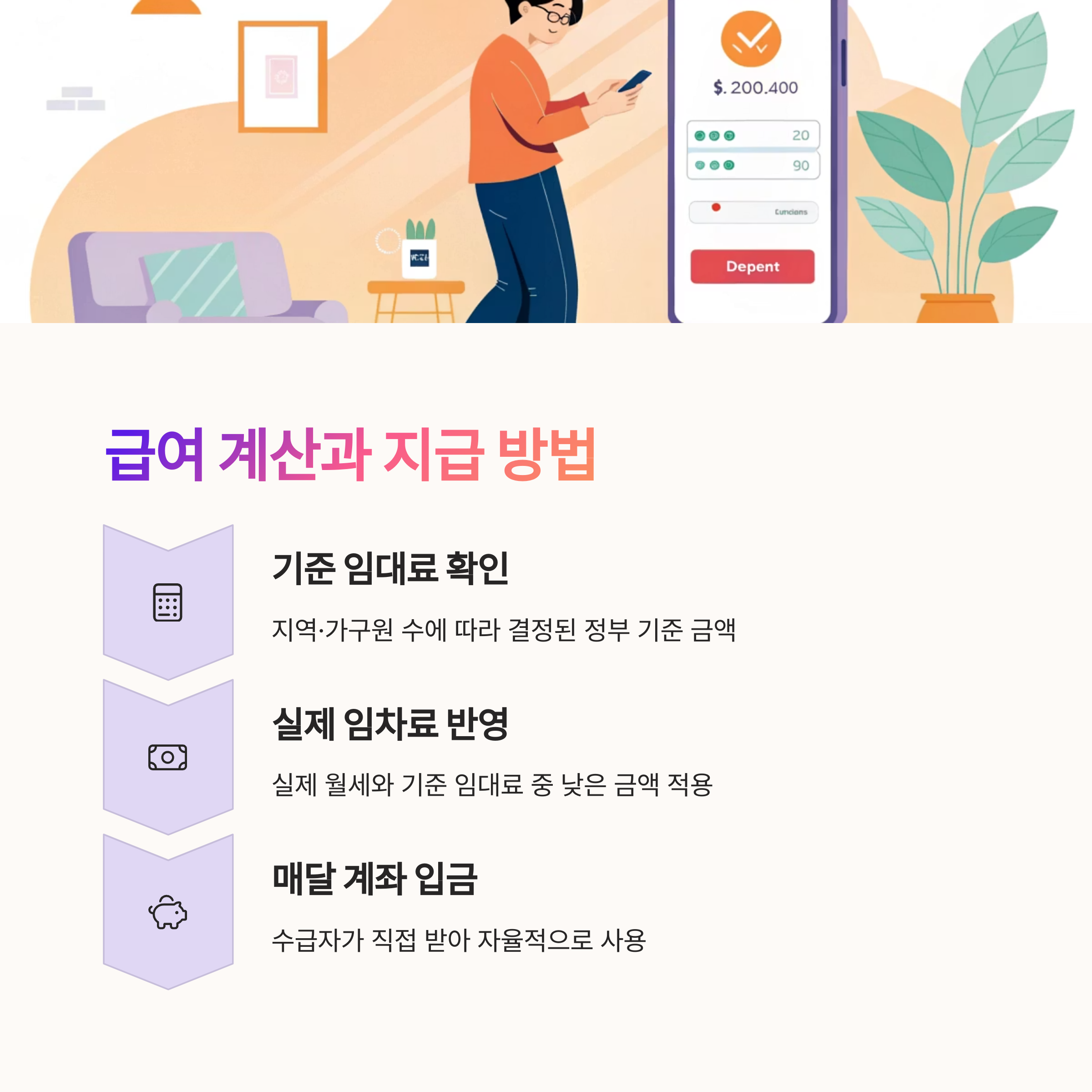 급여는 매달 해당 계좌로 현금으로 입금돼요. 임대인이 직접 받는 구조가 아닌, 수급자가 직접 받아서 자율적으로 지출할 수 있도록 설계되어 있답니다. 👛