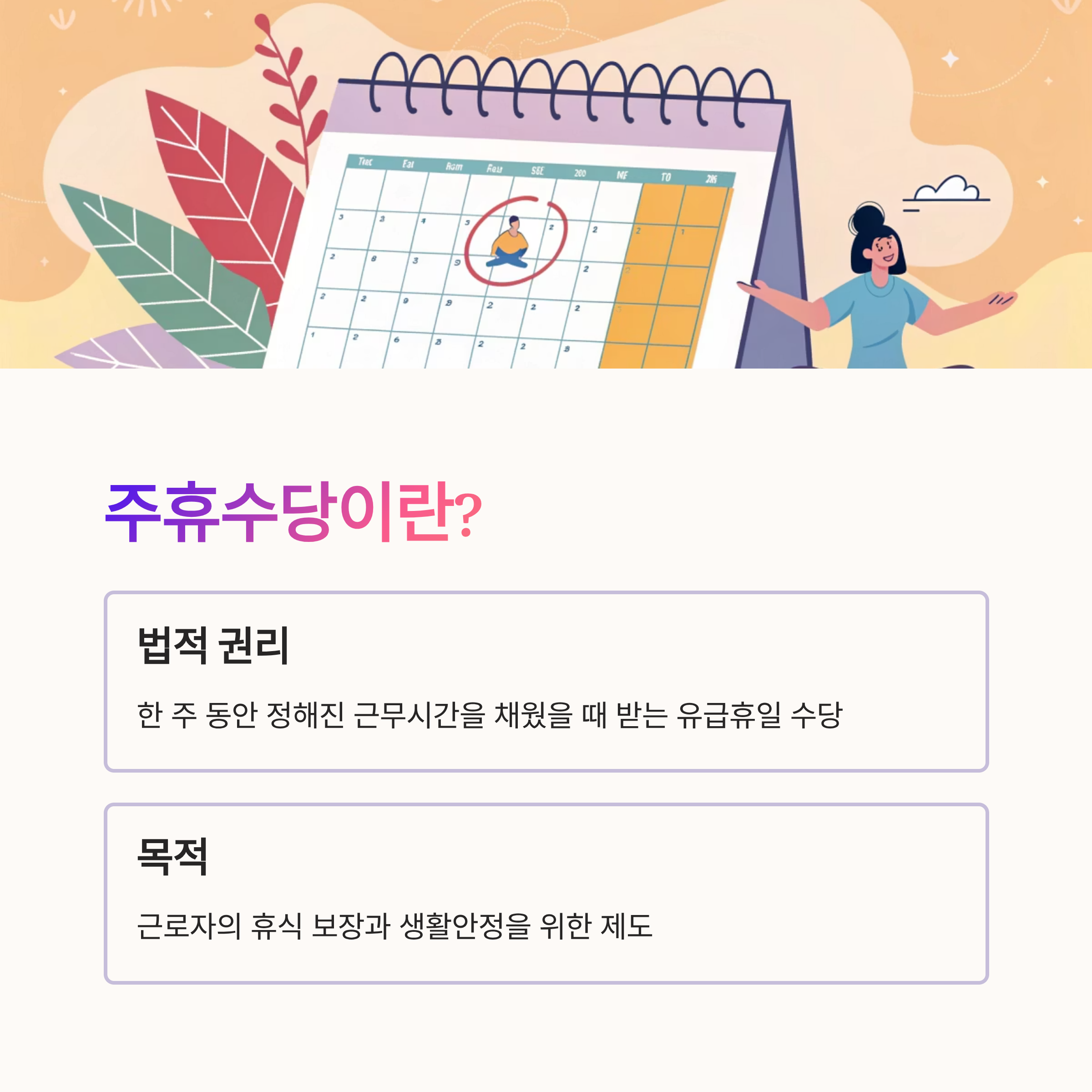 주휴수당은 단순히 추가로 받는 돈이 아니라, 근로자가 쉴 권리를 보장받는 핵심 제도예요. 법에서 주휴일을 부여하는 이유는 ‘일주일에 최소 하루는 휴식해야 건강하게 일할 수 있다’는 원칙 때문이에요. 따라서 주휴수당은 근로자의 건강권과 생활안정권을 동시에 지켜주는 장치라고 볼 수 있죠.