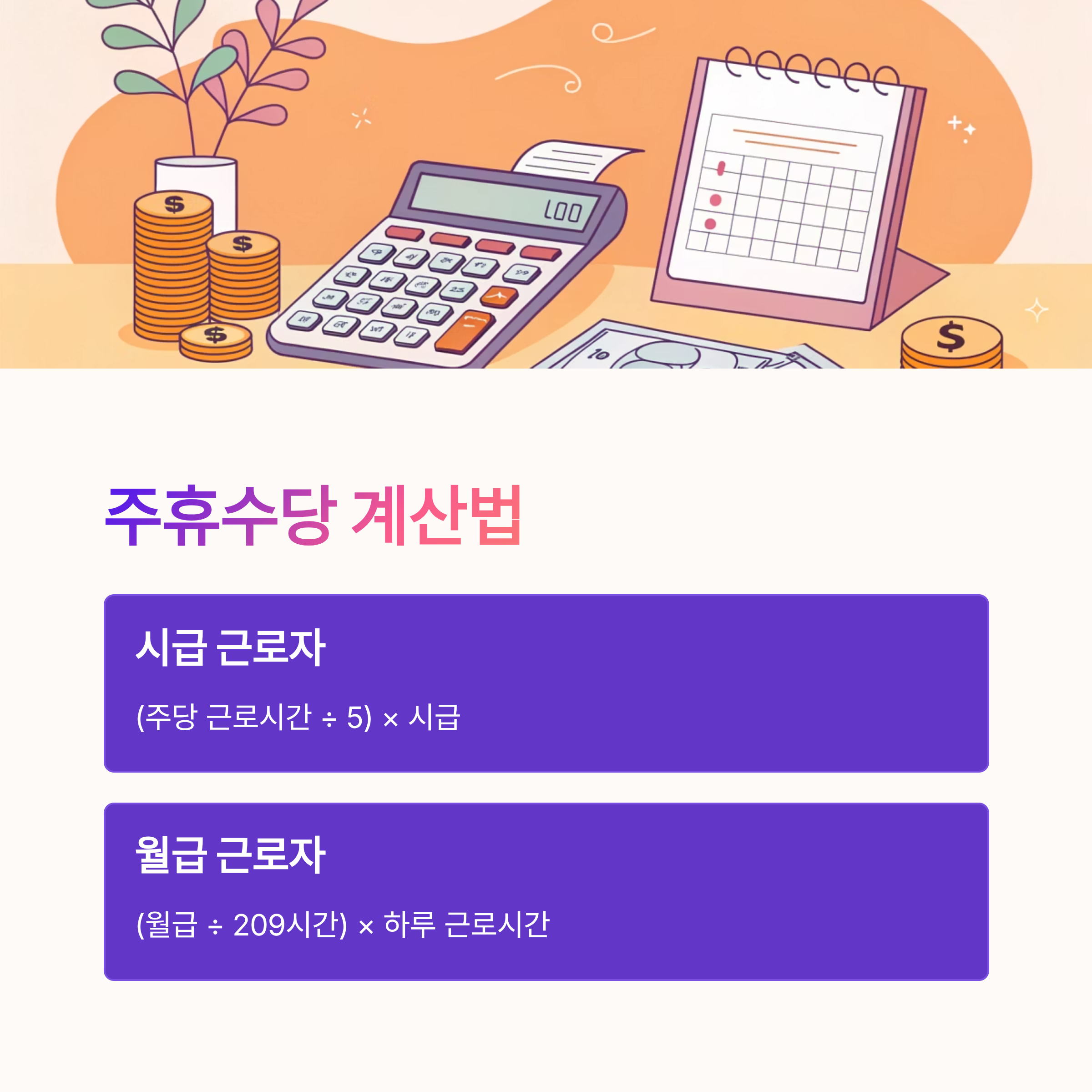 다음은 많은 분들이 헷갈려 하는 ‘주휴수당 계산 방법’이에요. 이 부분을 알면 주휴수당 금액을 스스로 계산해서 잘못 지급되는 걸 막을 수 있답니다. 💡