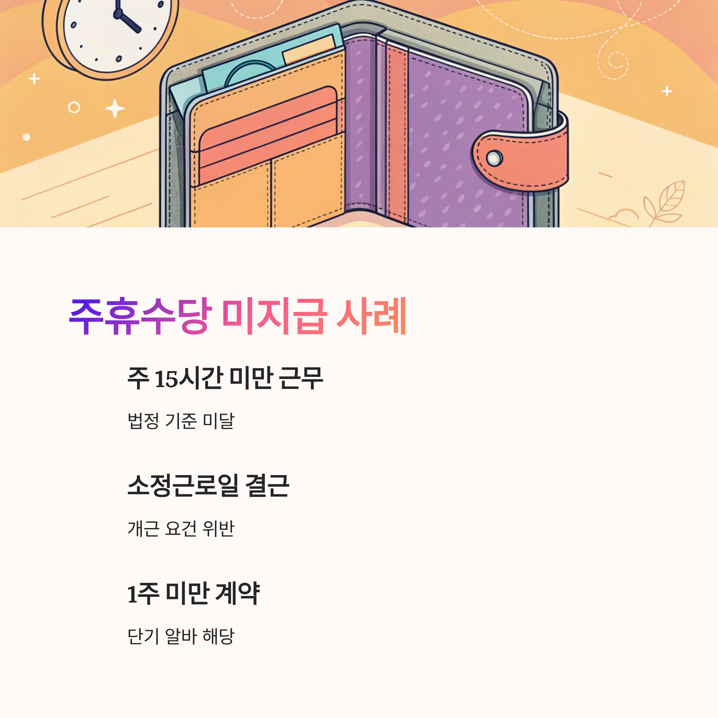 다음은 ‘주휴수당 미지급 사례와 예외’에 대해 설명할게요. 이 부분을 알면 부당한 대우를 받았는지 스스로 판단할 수 있어요. 🚫