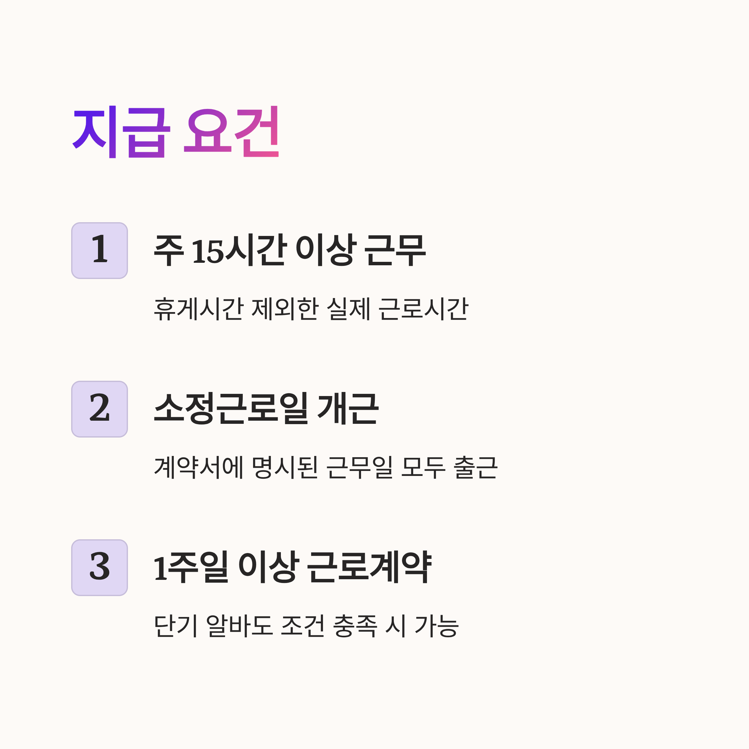 다음으로는 주휴수당을 받기 위해 꼭 필요한 ‘지급 요건’을 하나씩 설명할게요. 이 부분을 알아야 본인이 대상자인지 정확히 판단할 수 있거든요. 🚀