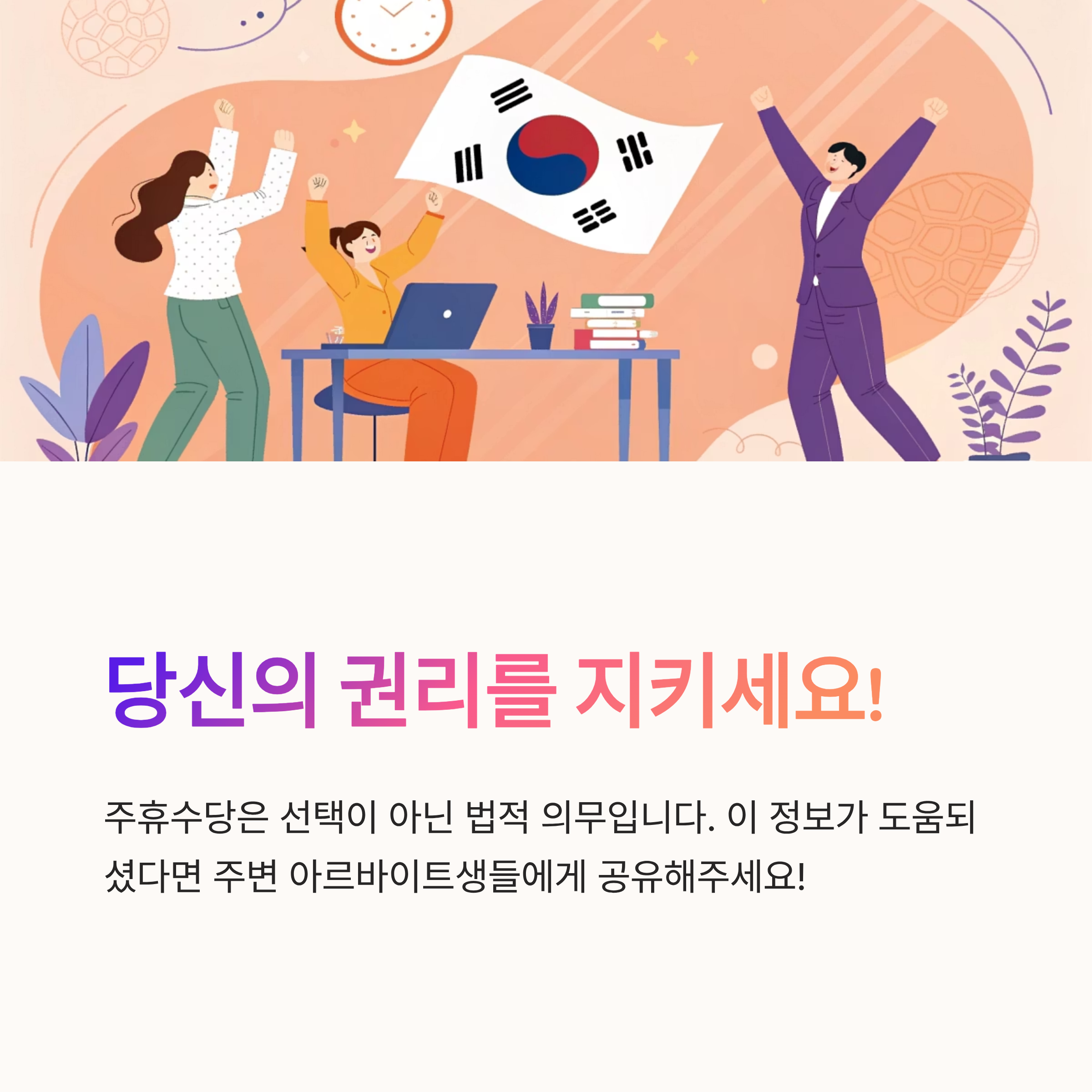 내가 생각했을 때 주휴수당의 가장 큰 의미는 ‘열심히 일한 사람에게 보장되는 당연한 권리’라는 점이에요. 회사나 사장이 ‘우린 주휴수당 안 줘요’라고 말한다면, 그것은 법적으로 말이 안 되는 거예요. 근로자는 권리를 알고 지킬 수 있어야 해요.