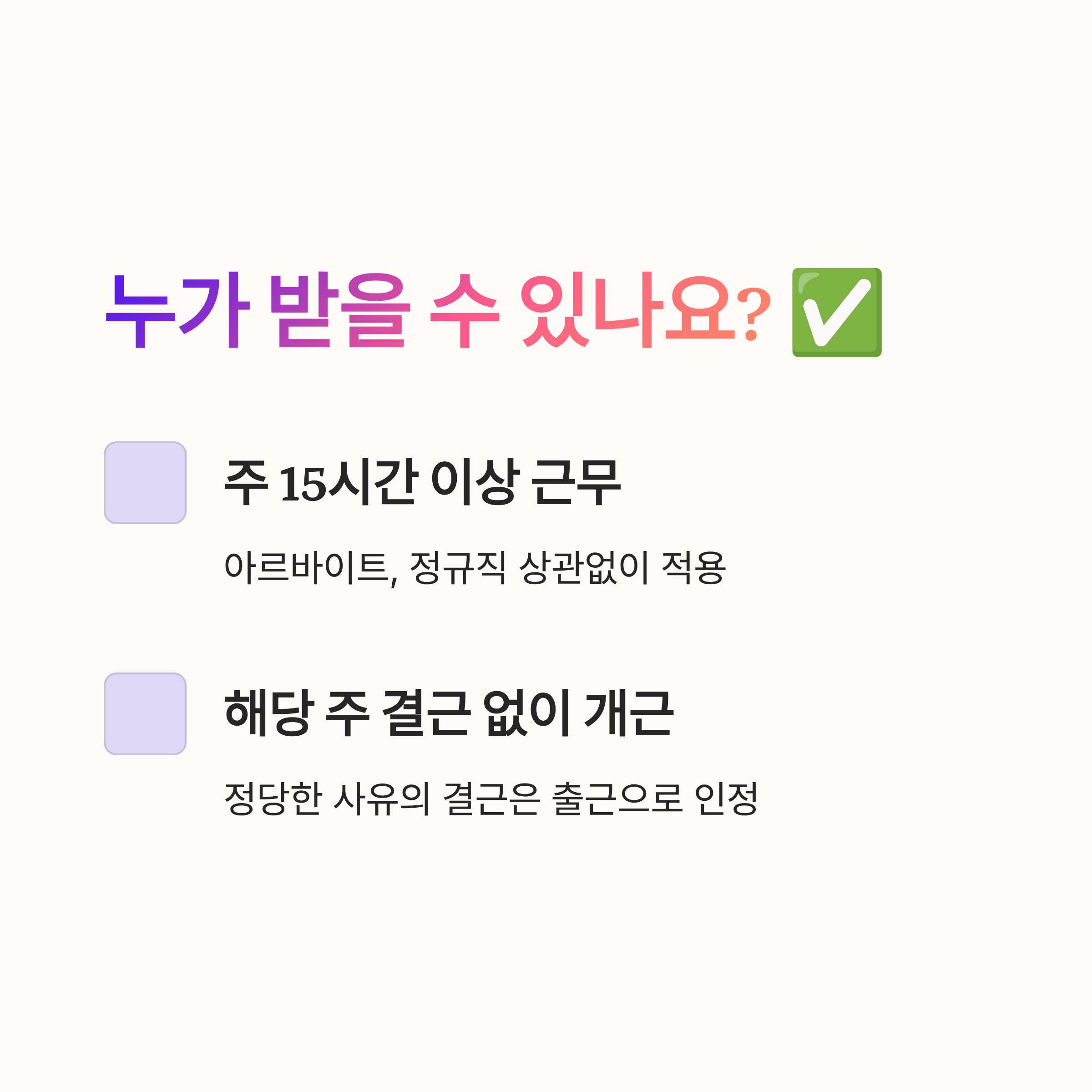 A1. 네, 주 15시간 이상 근무하고 해당 주에 결근이 없다면 아르바이트도 받을 수 있어요. 고용 형태와 무관하게 조건만 충족하면 동일하게 지급됩니다.