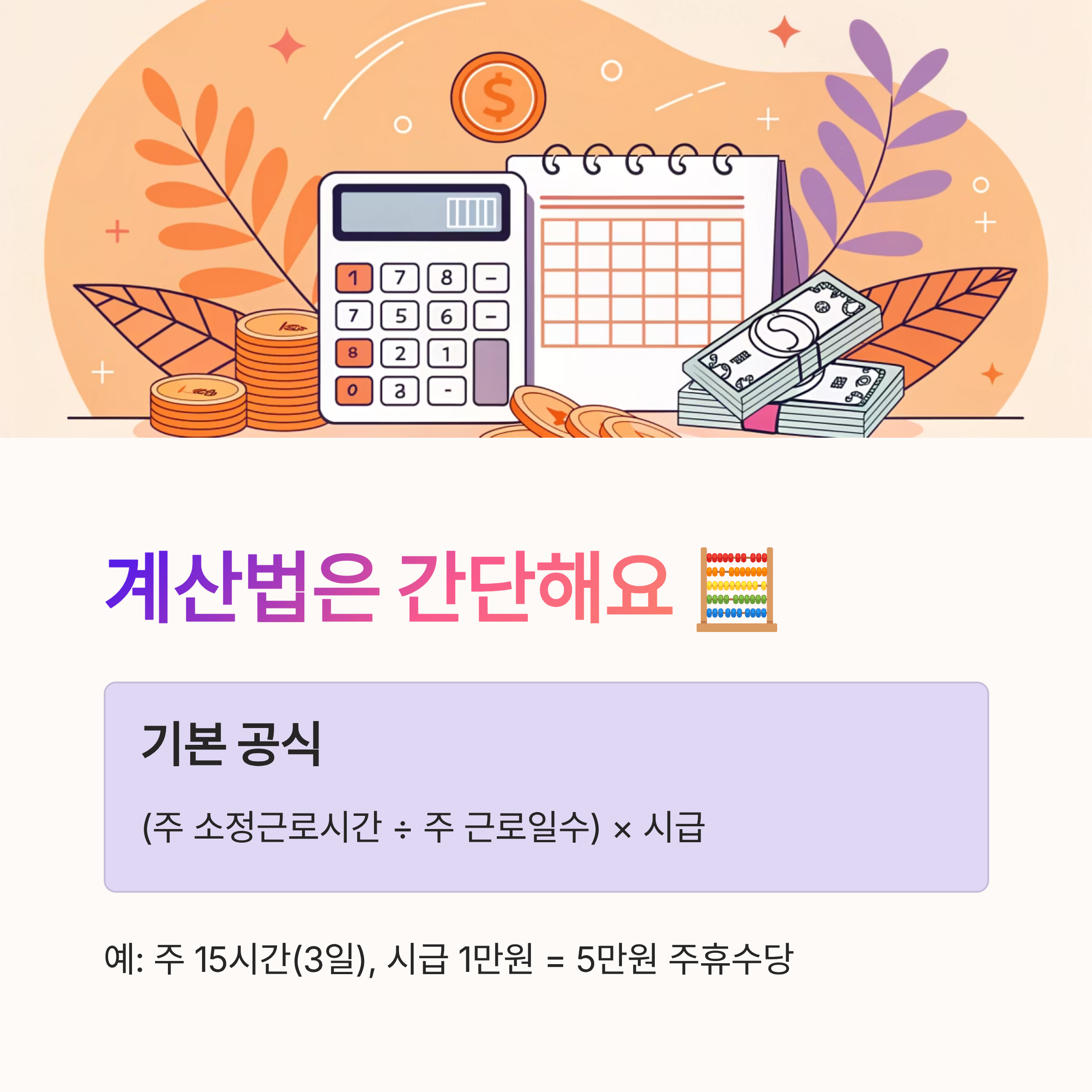 | 주휴수당 | 주 15시간 이상 + 개근 | 매주 | (주 소정근로시간 ÷ 주 근로일수) × 시급 |