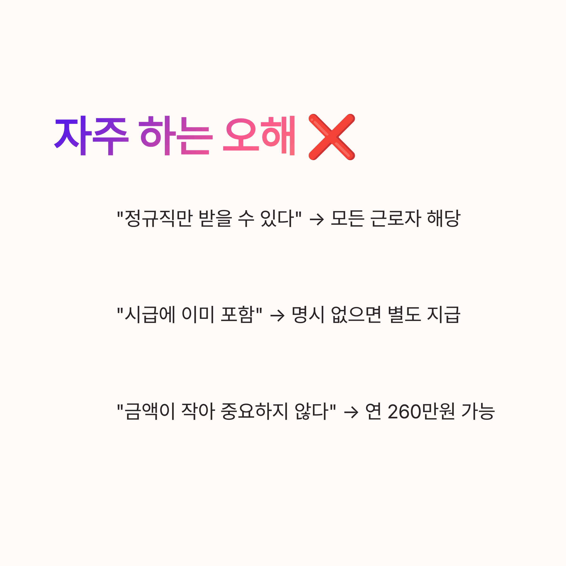 네 번째로, “주휴수당은 큰 금액이 아니라서 신경 안 써도 된다”는 생각도 있는데요. 실제로 매주 발생하기 때문에 1년 단위로 계산하면 상당한 금액이 돼요. 시급 1만 원 기준, 주휴수당 5만 원씩 52주면 연간 260만 원이니까 결코 무시할 수 없어요.