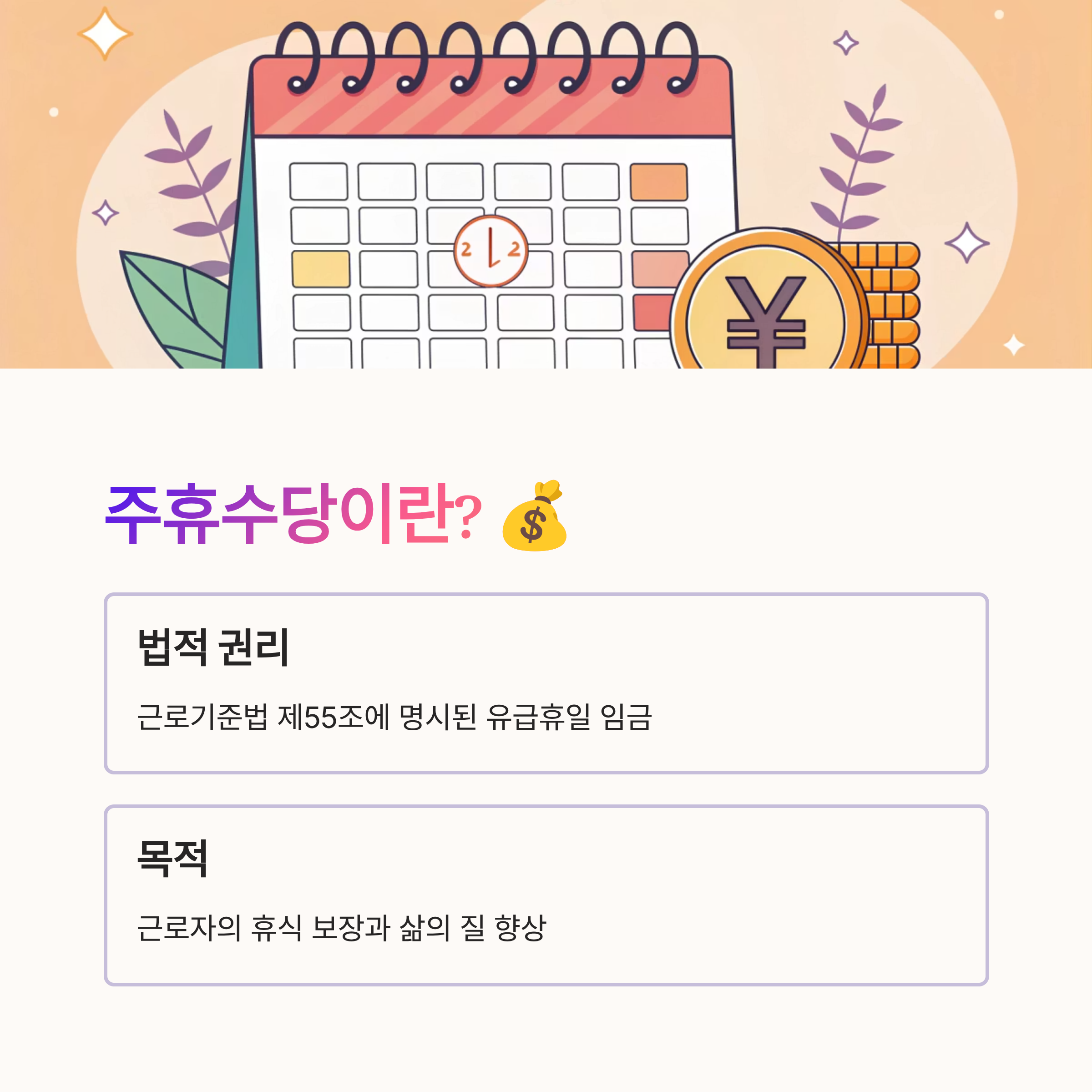 근로기준법 제55조에서 주휴수당을 명시하고 있고, 이를 통해 근로자가 최소한의 휴식을 보장받을 수 있도록 제도화한 것이랍니다. 특히 주휴수당은 아르바이트나 단기 근로자도 일정 요건을 충족하면 받을 수 있다는 점에서 중요한 권리예요.