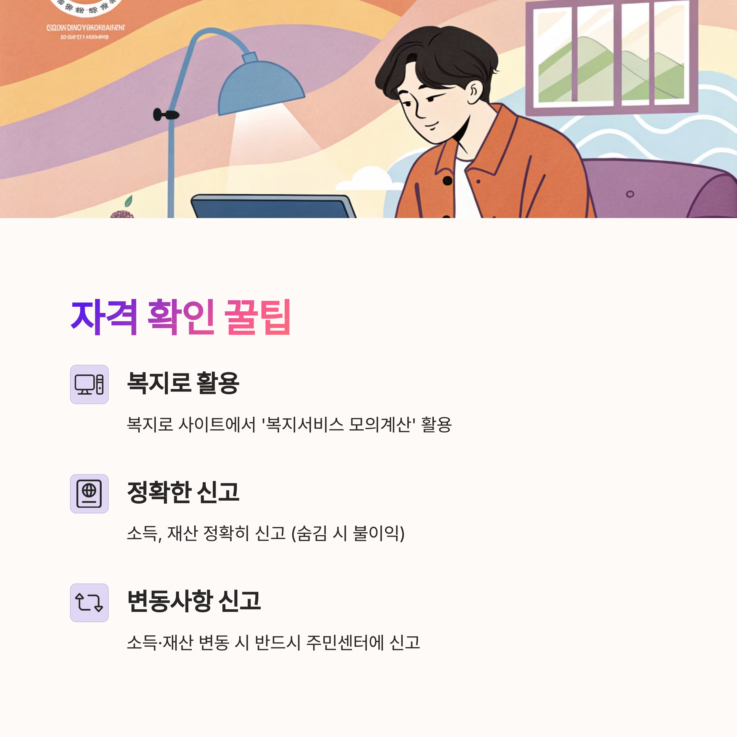 그리고 급여 수급 중에는 정기적으로 소득·재산 조사가 이뤄져요. 상황이 변동되면 수급이 중지되거나 금액이 줄어들 수 있으니, 모든 변동 사항은 반드시 관할 주민센터에 신고해야 해요.