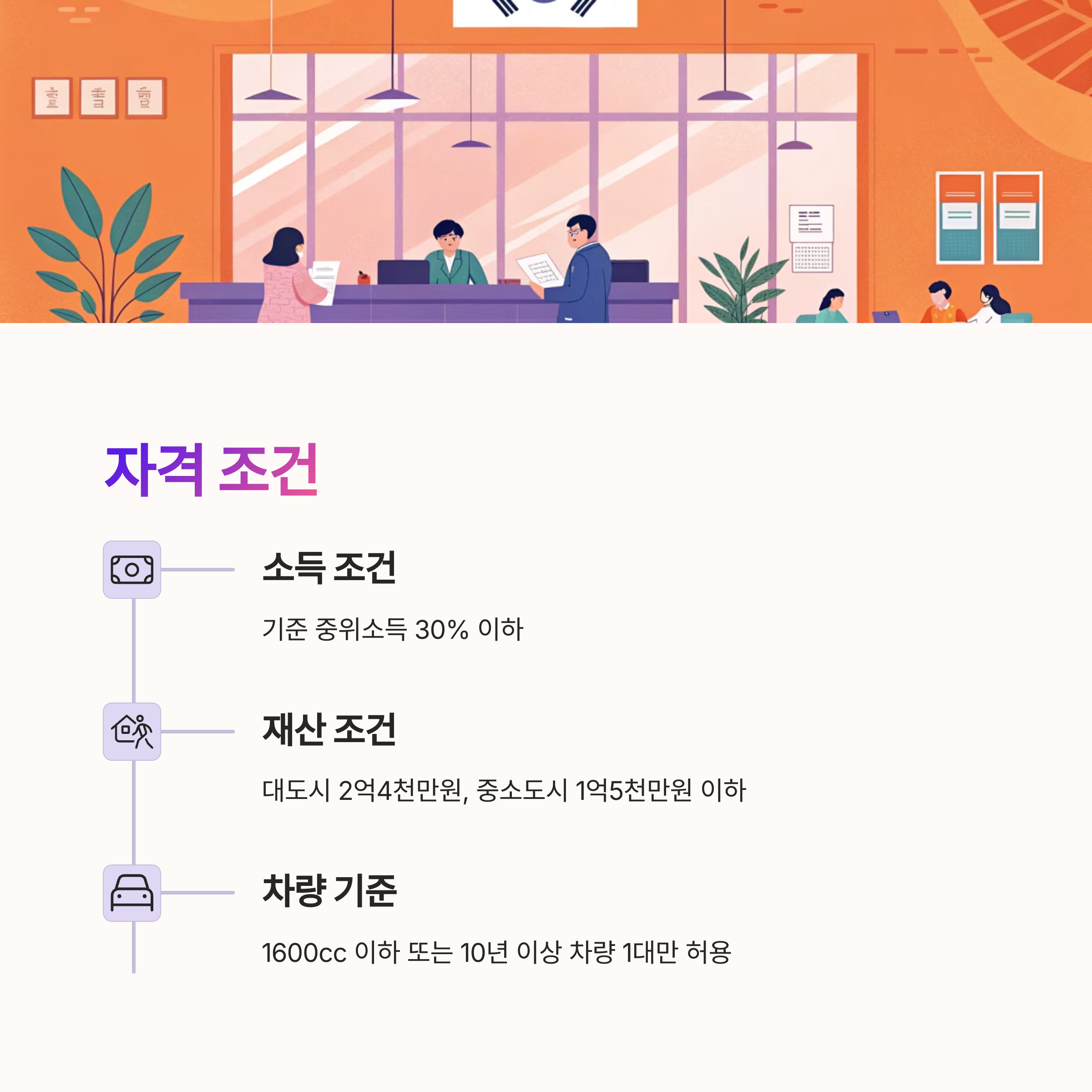 두 번째는 재산 조건이에요. 대도시는 2억4천만 원, 중소도시는 1억5천만 원, 농어촌은 1억3천만 원 이하의 재산을 보유해야 해요. 여기에는 자동차, 부동산, 예금 등 다양한 항목이 포함돼요.