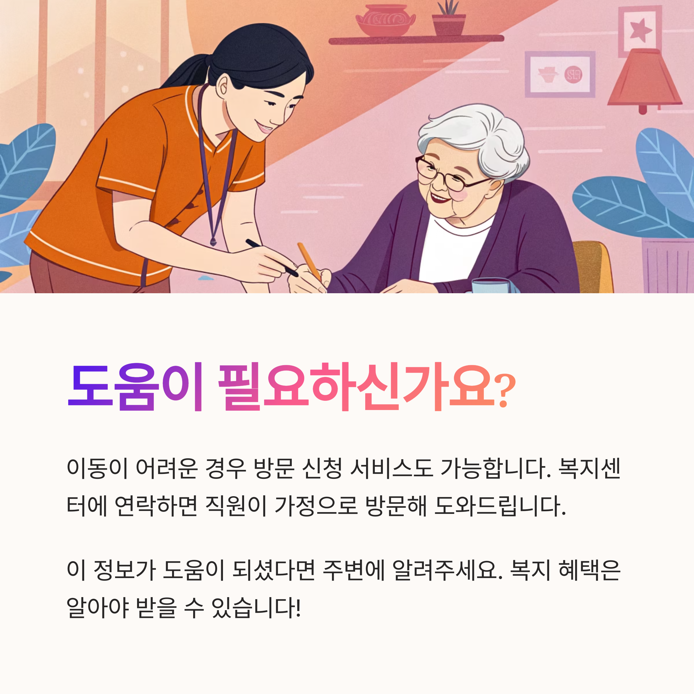 마지막 팁으로, 이동이 어려운 경우에는 방문 신청 서비스도 요청할 수 있어요. 복지센터에 미리 연락하면 직원이 가정으로 직접 방문해 도와주는 서비스가 마련돼 있답니다. 이런 제도는 잘 활용해야 해요.