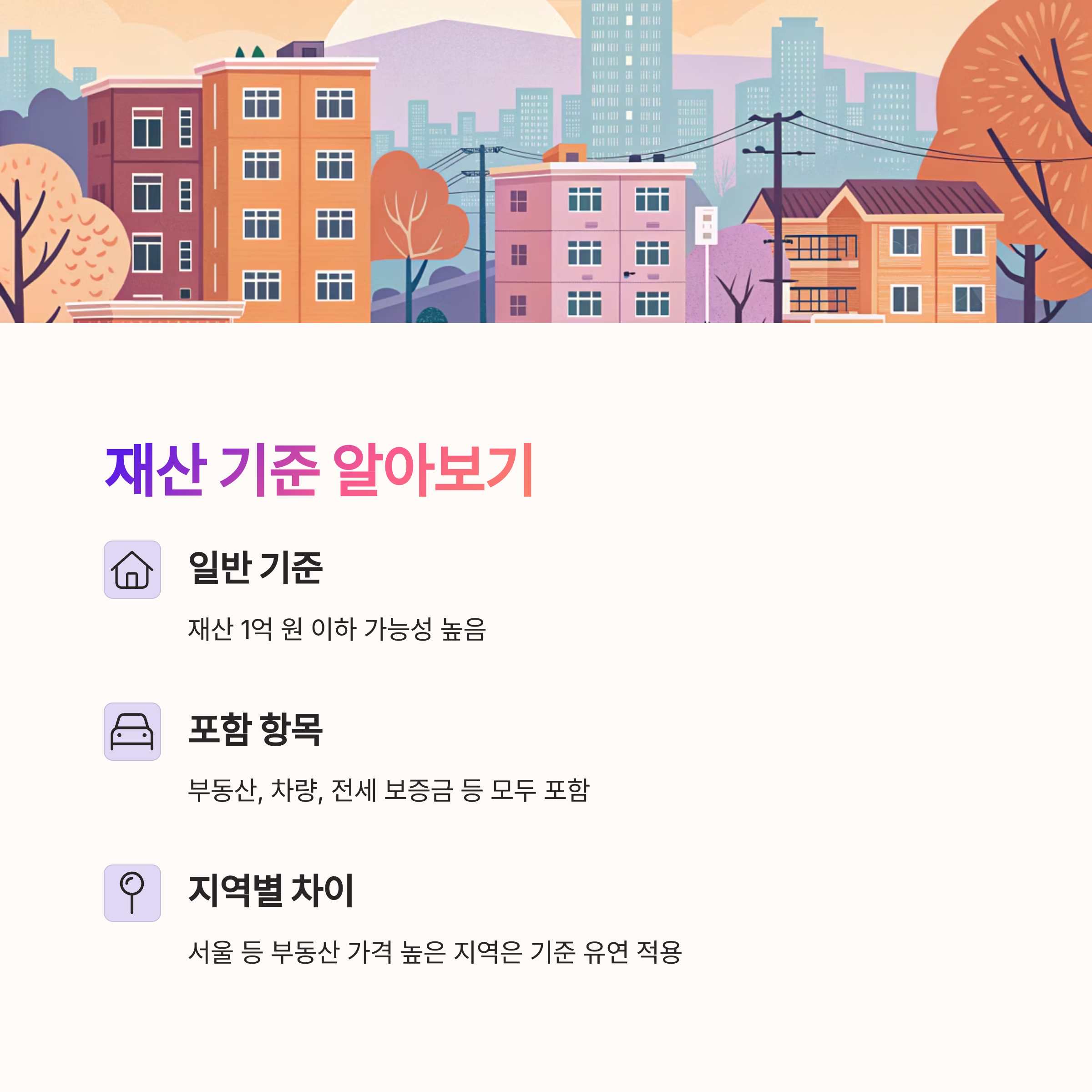 재산 기준은 지역마다 달라요. 예를 들어 서울처럼 부동산 가격이 높은 지역은 기준이 조금 더 유연하게 적용되기도 해요. 보통은 재산이 1억 원 이하일 경우 가능성이 있어요. 하지만 전세 보증금도 포함되니 주의해야 해요.