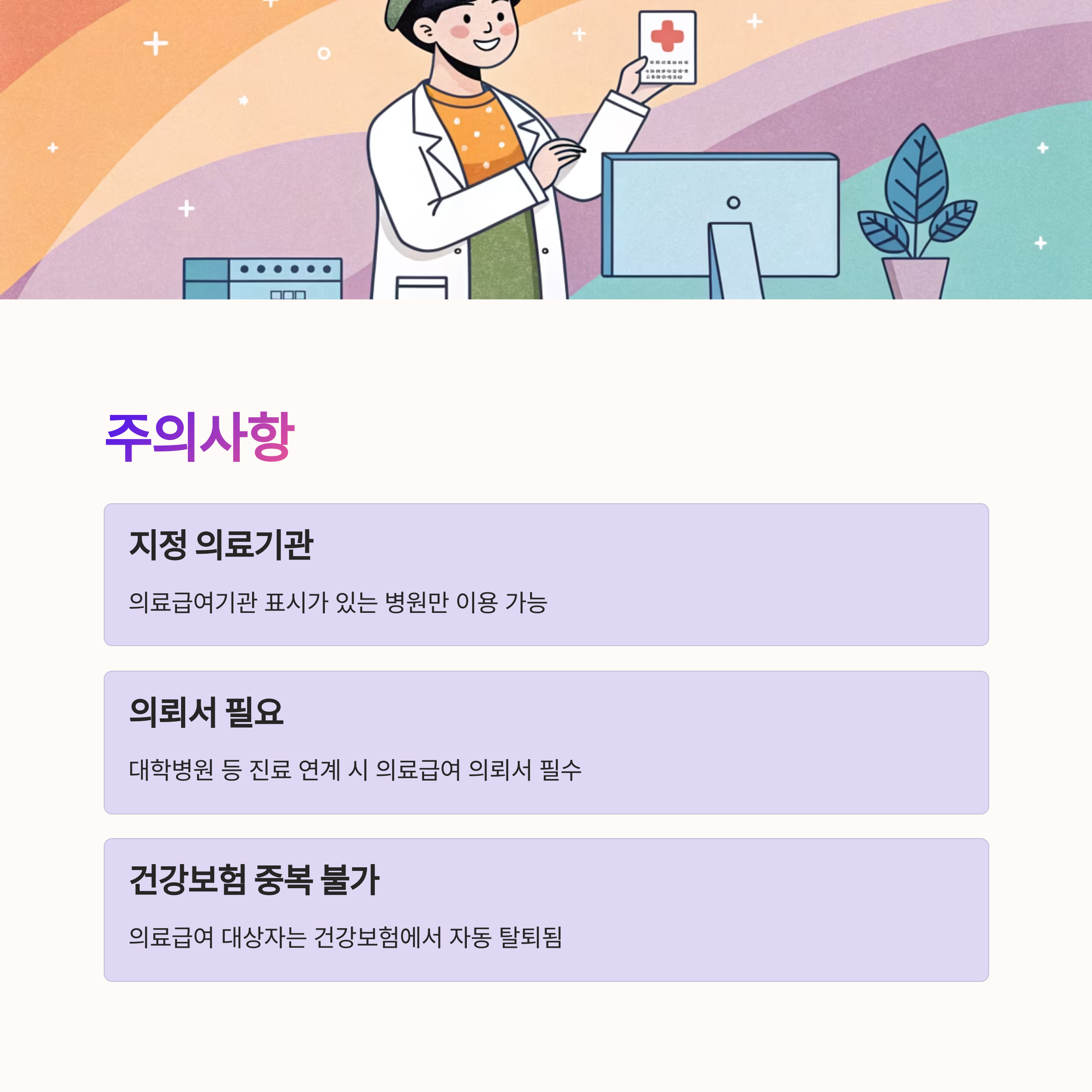 또한 백내장, 인공관절, 심장질환, 암 등 고가 진료 항목은 본인부담을 줄여주는 추가 지원이 있어요. 단, 지정된 의료기관을 이용해야 하며, 의료급여 의뢰서가 필요할 수 있어요.