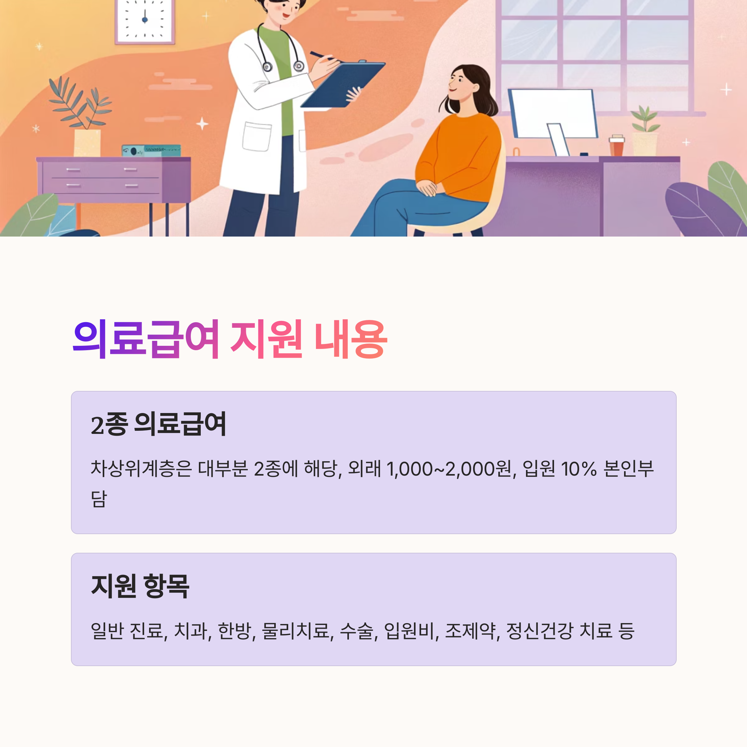 의료급여는 크게 1종과 2종으로 나뉘어요. 차상위계층은 대부분 2종에 해당되며, 1종은 기초생활보장 수급자 등 더 취약한 계층이 대상이에요. 2종 의료급여 수급자도 입원, 외래, 약제비 등 다양한 의료비에 대해 지원을 받아요.