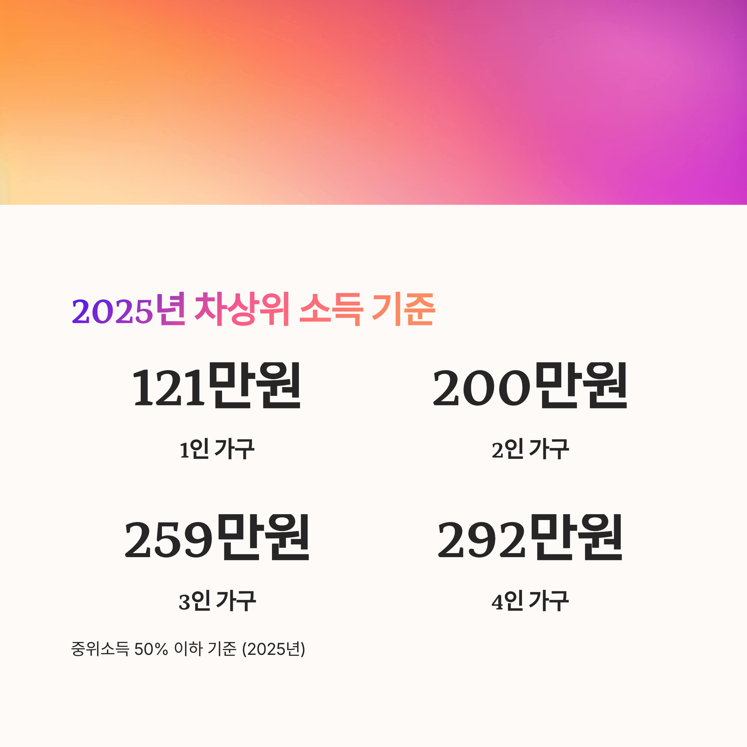 | 가구원 수 | 중위소득 (원) | 50% 기준 (차상위) |