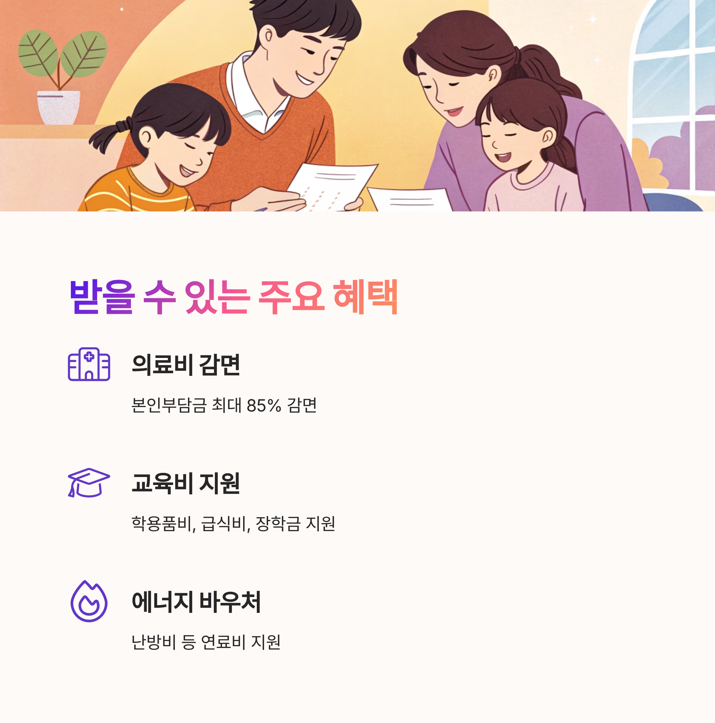 정부는 이 계층에게 의료비 감면, 에너지 바우처, 자녀 교육비 지원 등 실생활에 필요한 혜택을 제공하고 있어요. 복지 혜택이 꼭 필요한데도 몰라서 놓치고 있는 분들이 너무 많아요. 그래서 오늘은 이 제도를 제대로 알고 활용하는 게 정말 중요하답니다.