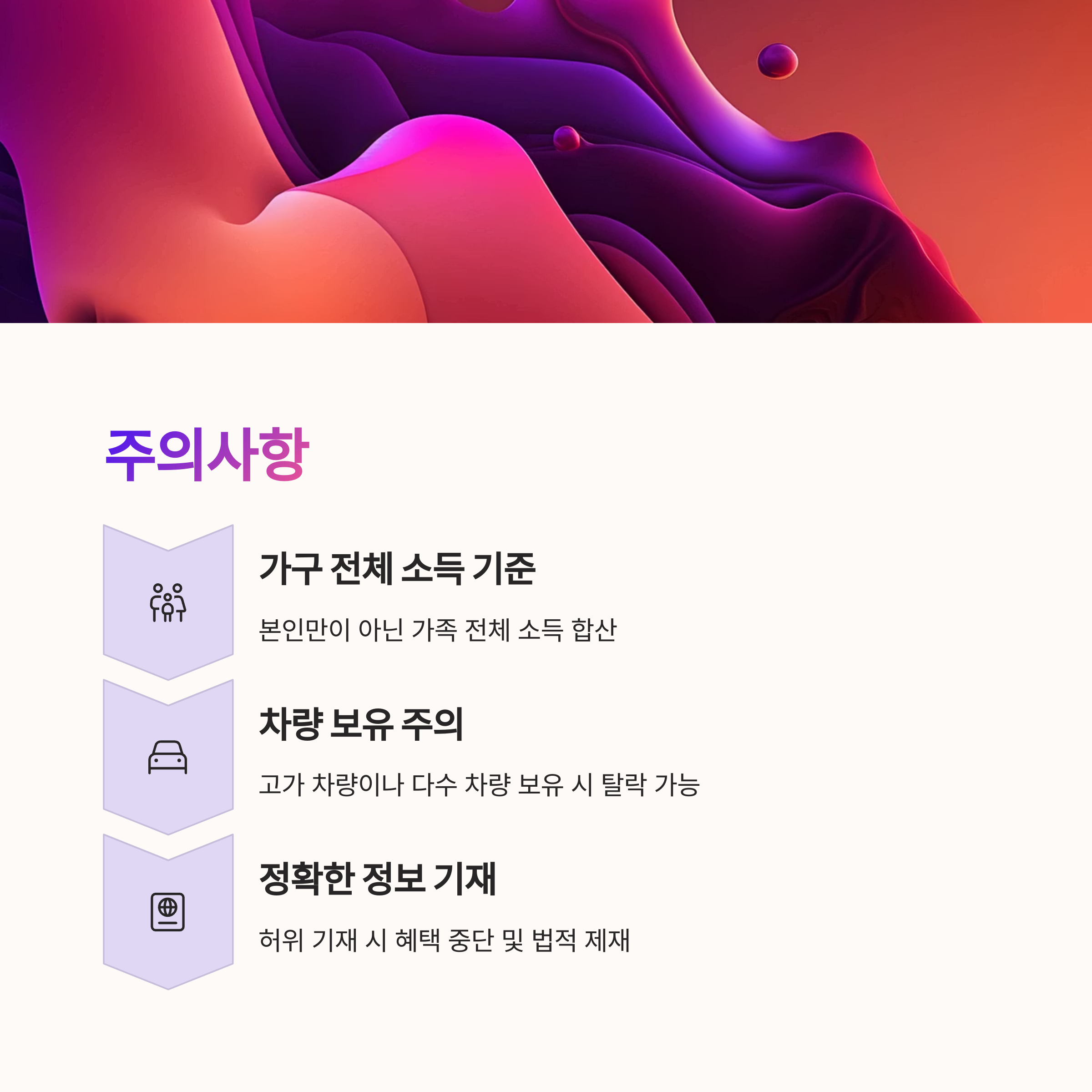 또한 차량 보유로 인한 탈락 사례가 많아요. 고가의 차량이 있거나, 차량이 여러 대일 경우 재산 기준을 초과하게 되어 자격이 안 될 수 있어요. 이 점은 특히 지역가입자 가정에서 주의해야 해요.