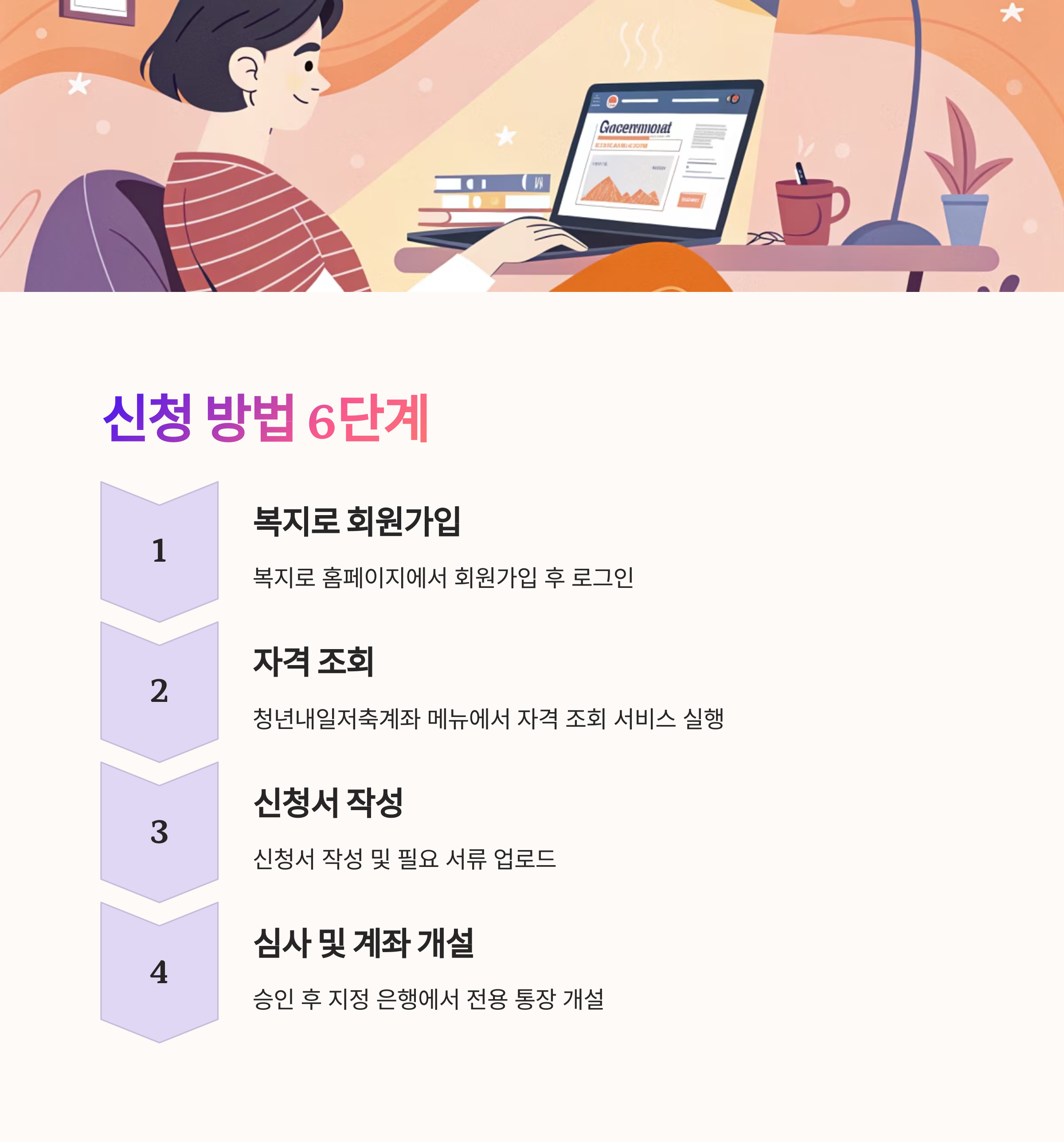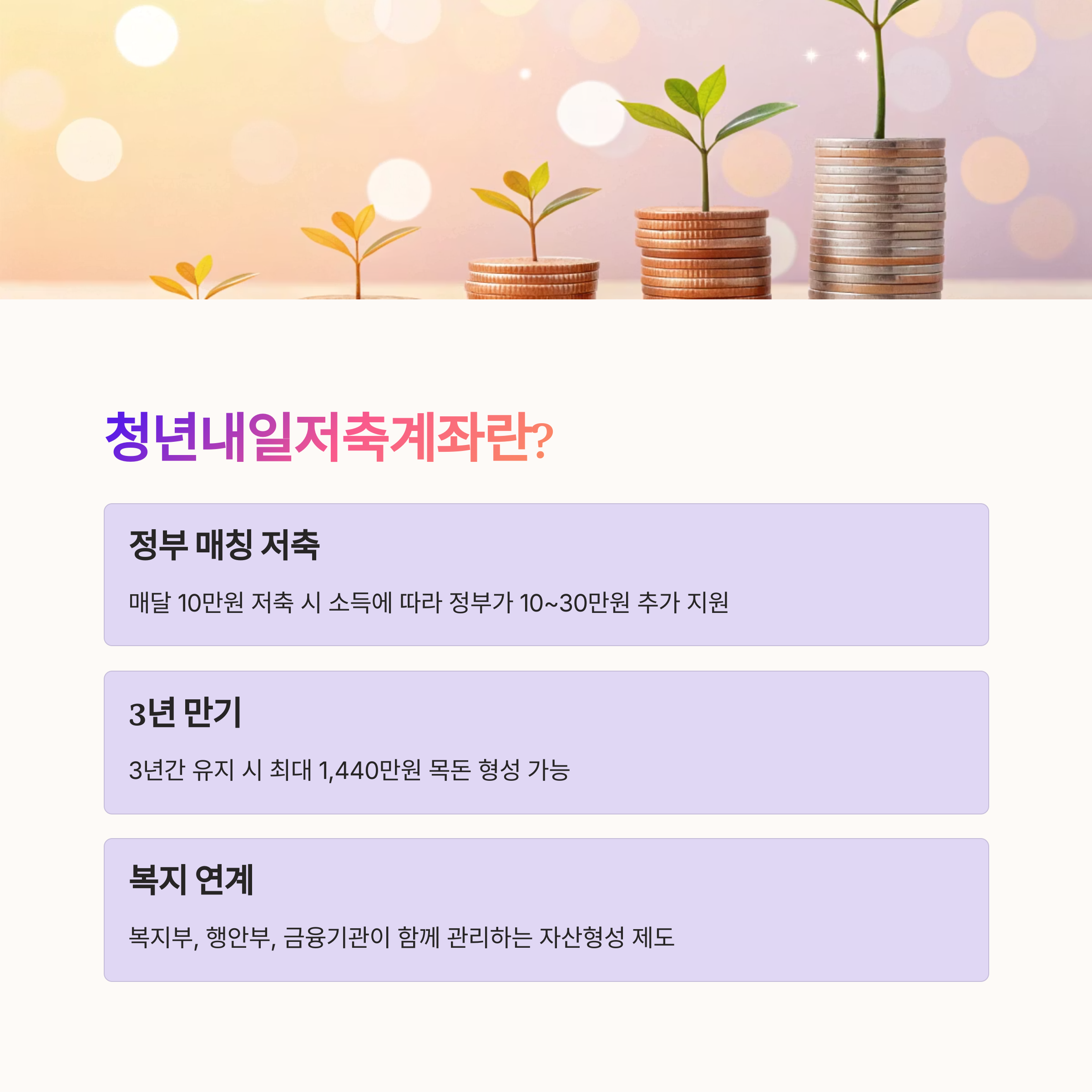 💡청년내일저축계좌는 저소득 청년이 목돈을 모을 수 있도록 정부가 도와주는 매칭형 저축 제도예요. 매달 10만 원씩 저축하면 정부가 추가 지원금을 더해주는 제도로, 미래 자산을 형성하기에 아주 좋은 기회랍니다.