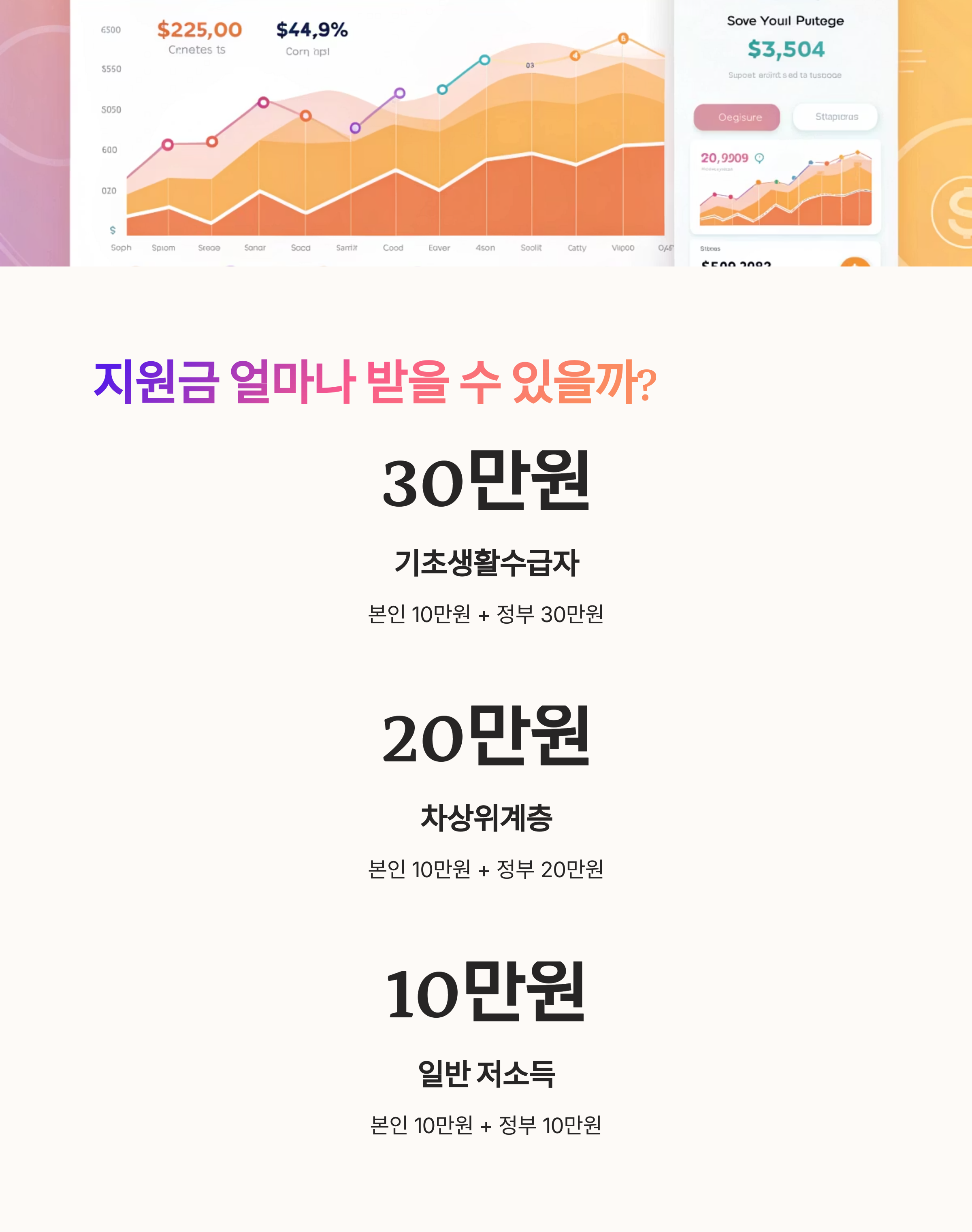 | 차상위계층 | 월 20만 원 | 본인 10만 + 정부 20만 | 자산기준 충족 |