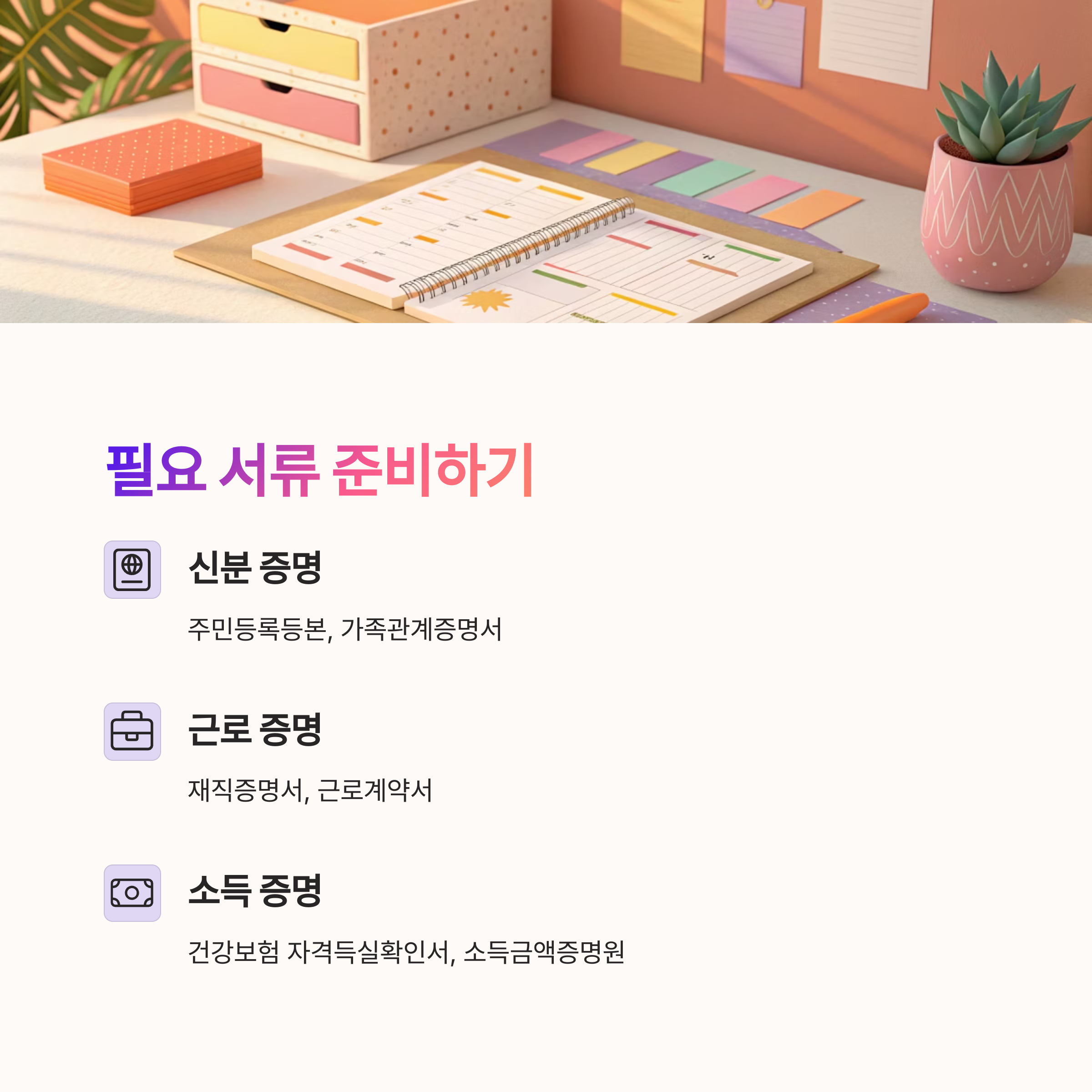 이 외에도 재산 및 소득 조사를 위한 개인정보 제공 동의서, 본인 명의 통장사본, 재직증명서나 근로계약서 등의 근로 증빙 서류가 필요할 수 있어요. 직장인과 프리랜서, 사업자에 따라 준비 서류가 달라질 수 있으니 해당 유형을 확인하는 것이 중요해요.