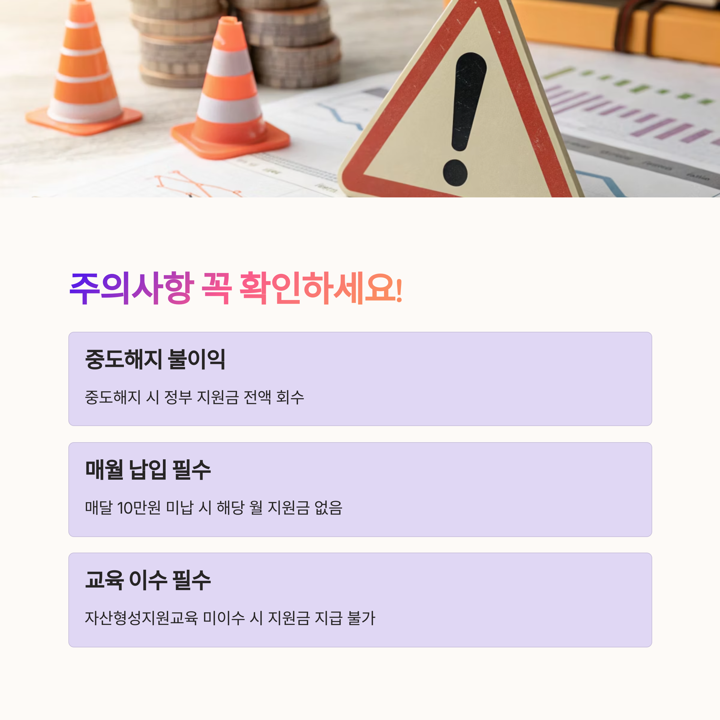⚠️ 가장 중요한 건 중도 해지예요. 중도에 계좌를 해지하거나, 조건을 충족하지 못하면 그동안의 정부 지원금을 전부 받을 수 없어요. 심지어 일부는 환수 조치될 수 있으니, 시작한 이상 꾸준한 유지가 핵심이에요.