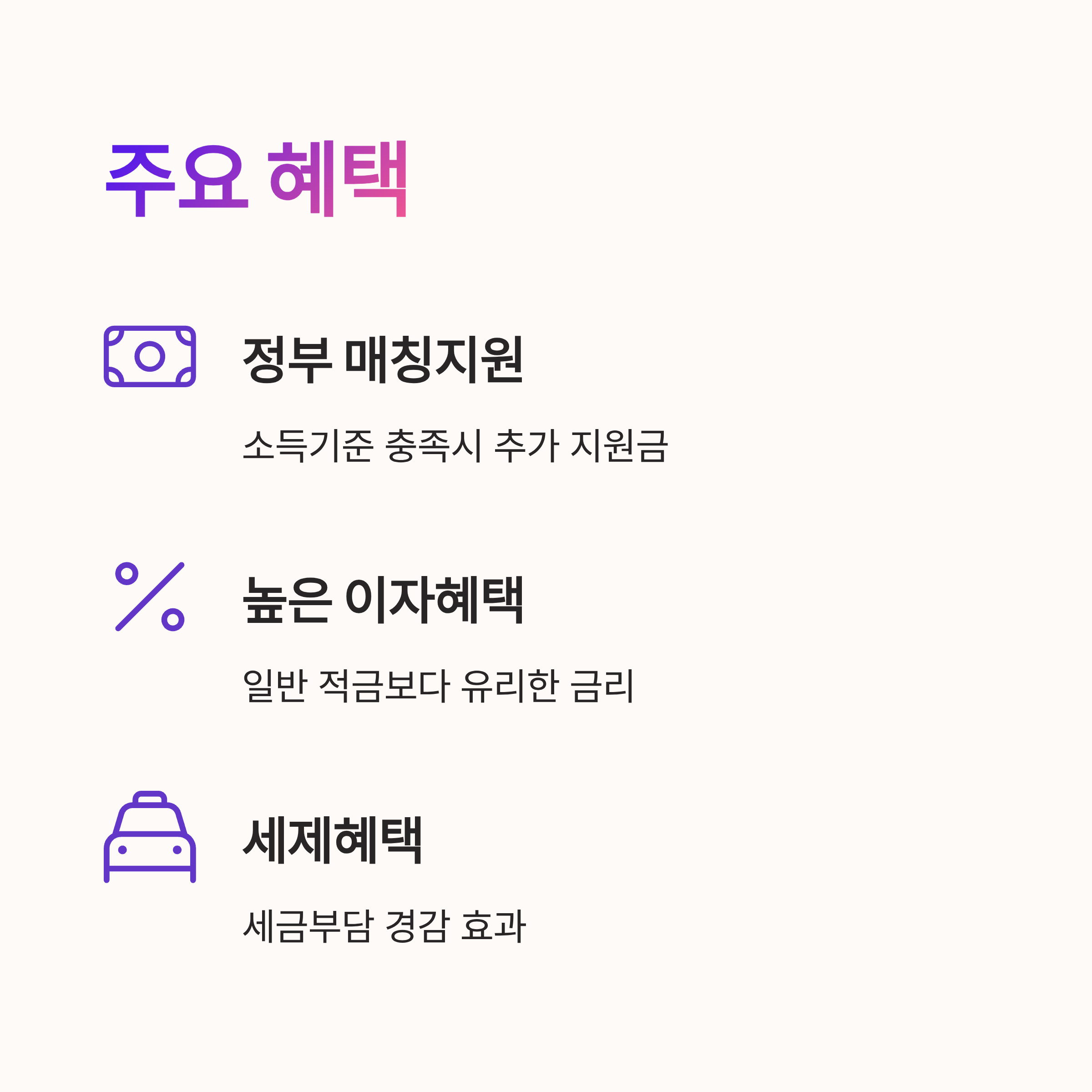 또한 소득 요건이 중요한데, 연 소득이 일정 기준 이하일 경우에만 정부 지원 혜택을 받을 수 있어요. 연 소득 상한선을 초과하면 단순 적금처럼 활용할 수는 있지만 정부 매칭 지원금은 받지 못해요. 따라서 본인의 소득 규모를 먼저 확인해야 해요.
