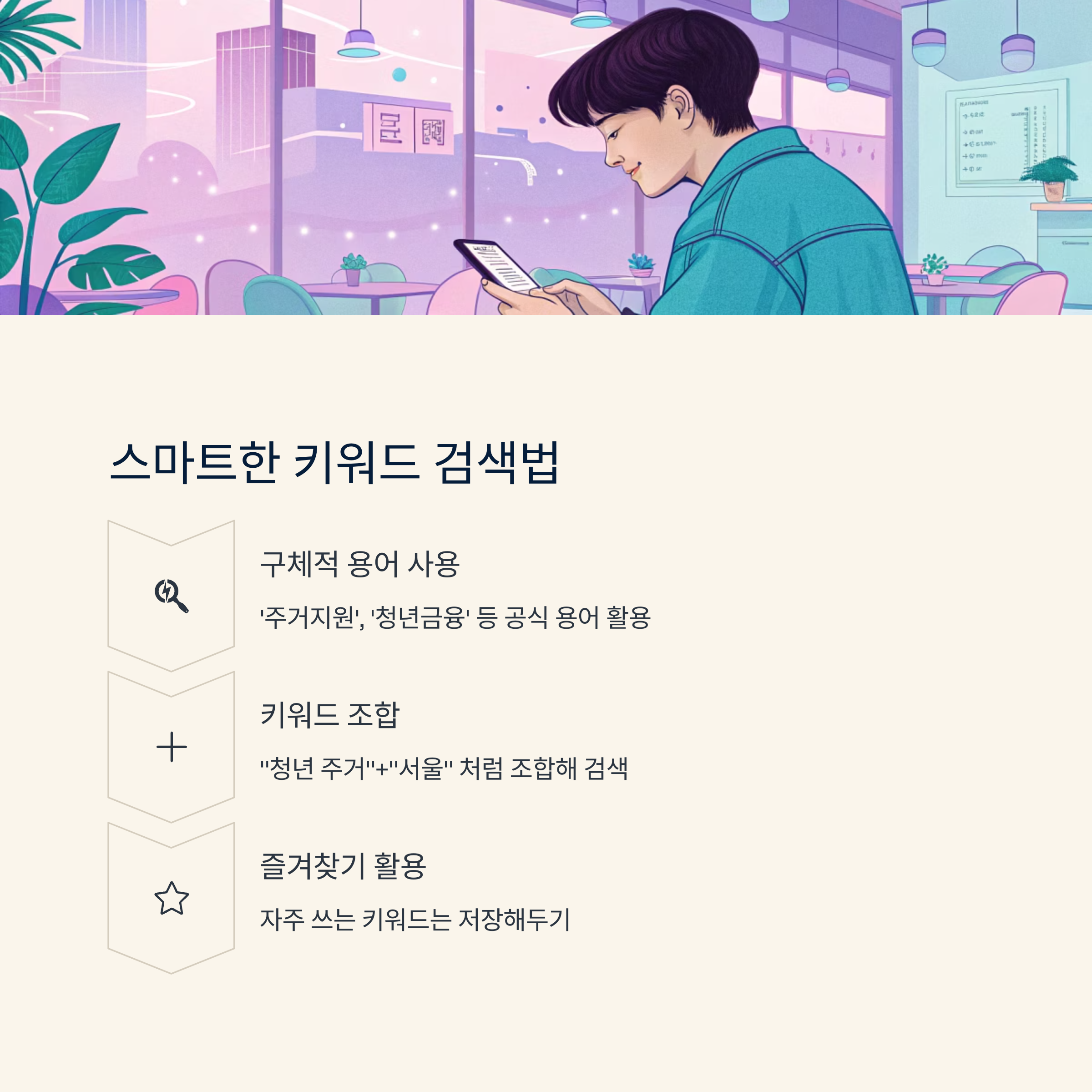 또한 키워드를 두 개 이상 조합하면 더 좋은 검색 결과를 얻을 수 있어요. 예를 들어 “청년 주거”+“서울”이라고 하면 서울 지역 주거 정책만 딱 뽑아볼 수 있죠.