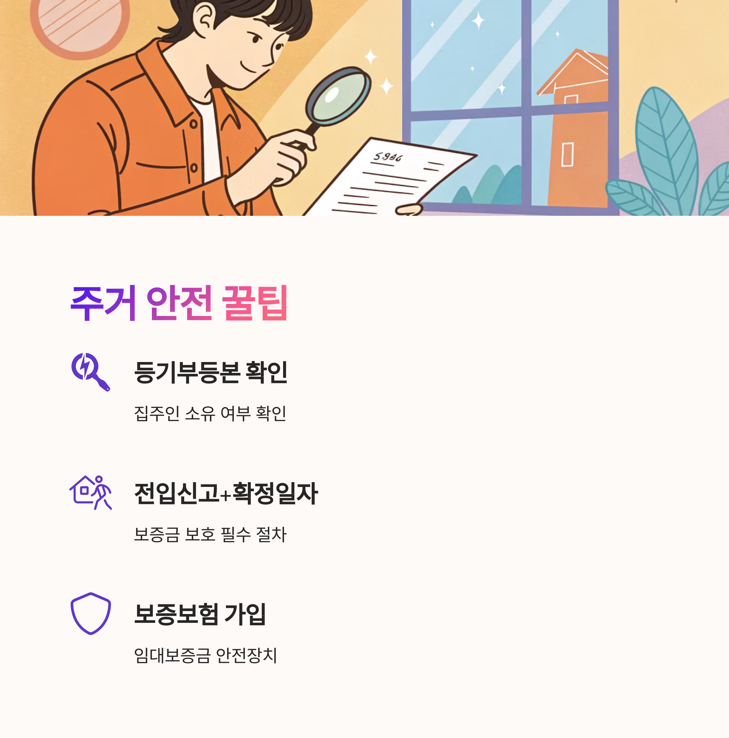두 번째는 ‘전입신고와 확정일자 받기’예요. 집에 이사하자마자 동주민센터 또는 정부24를 통해 전입신고하고, 임대차계약서에 확정일자를 받아야 보증금 보호를 받을 수 있어요. 순위보전권이 생기기 때문에 혹시 모를 위험도 줄일 수 있어요.