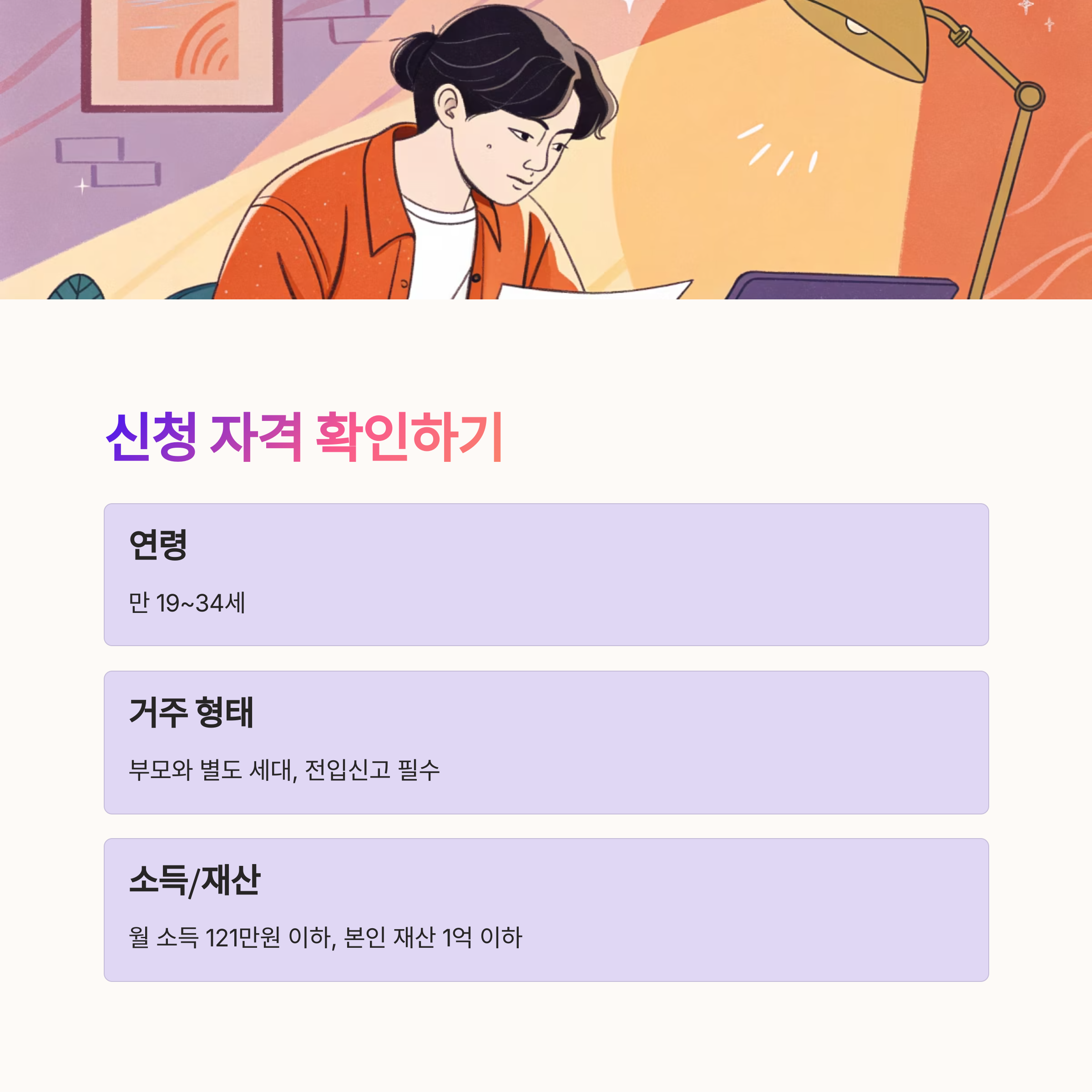 청년월세지원금을 받기 위해선 반드시 충족해야 할 자격 요건이 있어요. 크게는 연령, 거주 형태, 소득 요건, 재산 요건으로 나뉘며, 이 중 하나라도 기준에 맞지 않으면 신청이 불가능해요.