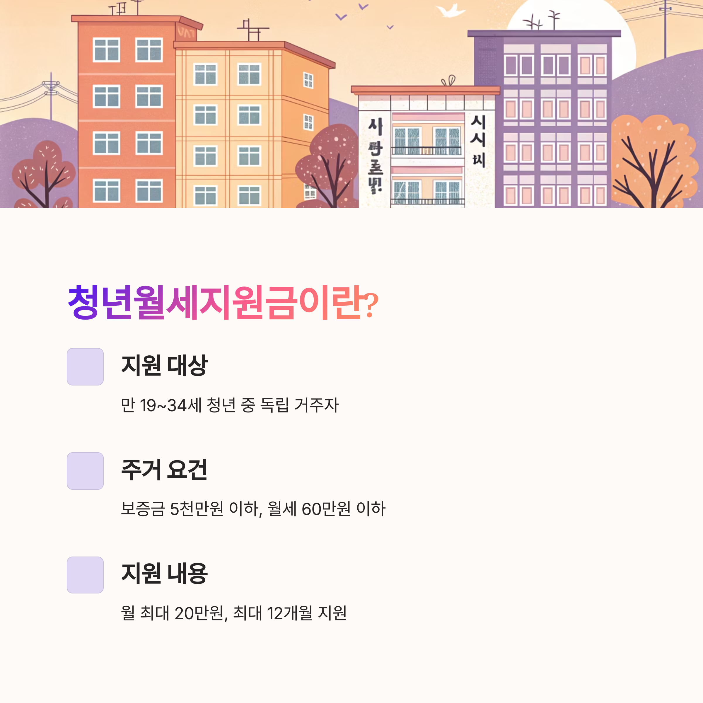 | 지원대상 | 만 19~34세 청년 중 독립 거주자 |