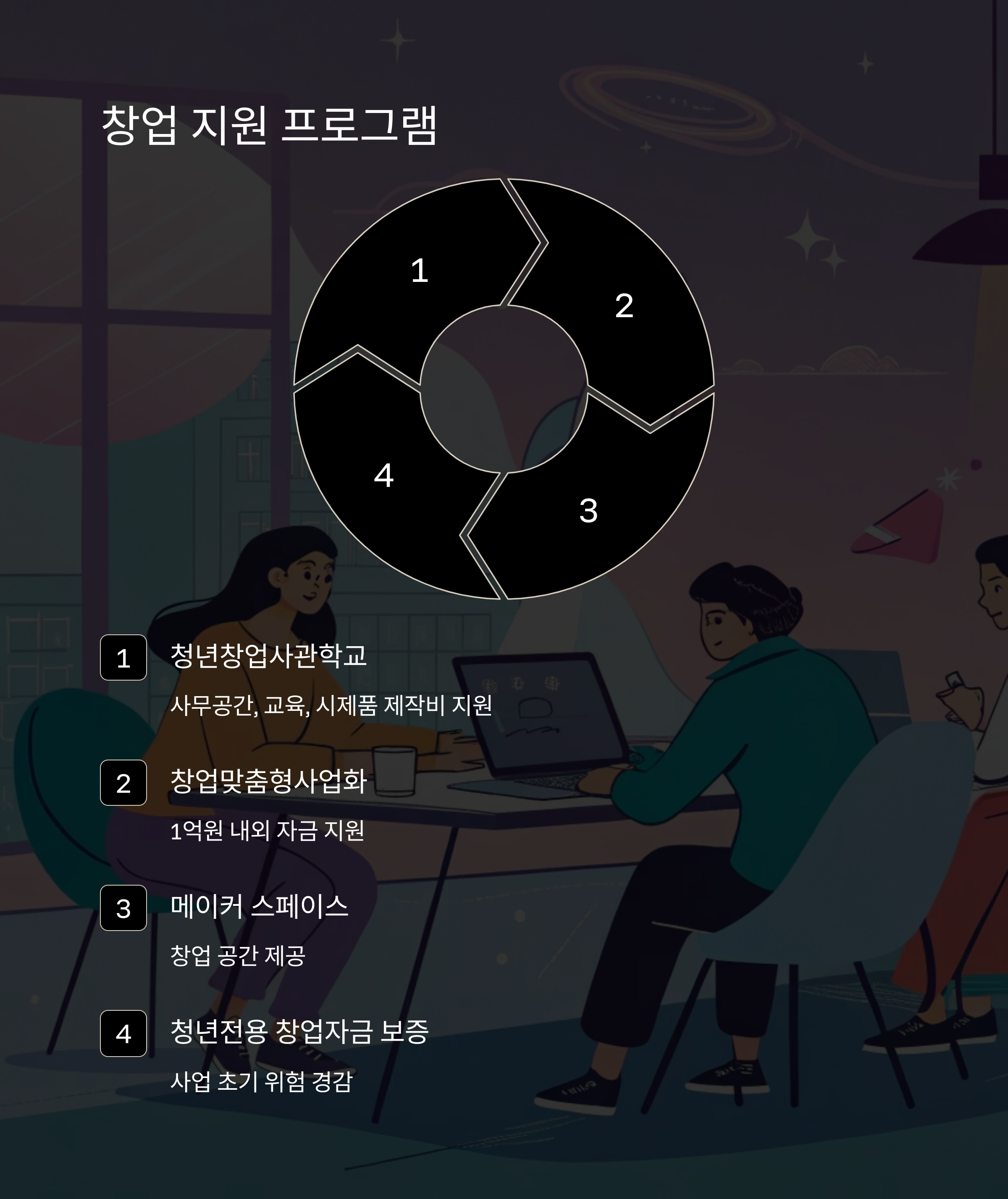 이 외에도 창업 공간을 제공하는 '메이커 스페이스', 사업 초기 위험을 덜어주는 '청년전용 창업자금 보증' 등도 있으니 지역 창업센터를 통해 상담해보는 게 좋아요.