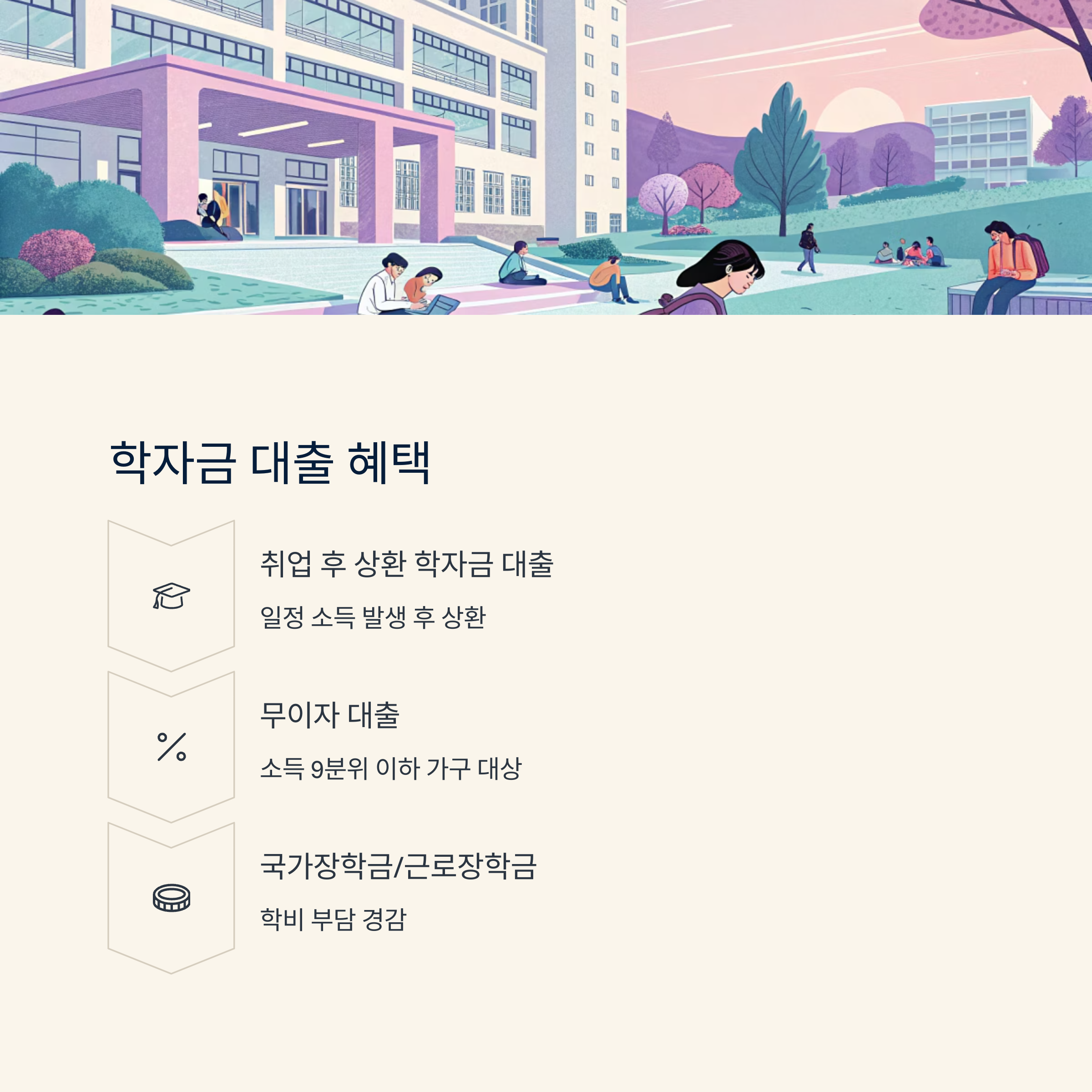 소득 9분위 이하의 가구는 '무이자 대출'도 가능하고, 일정 소득이 발생하기 전까지는 원금과 이자를 갚지 않아도 되는 구조예요. 실제로 많은 대학생들이 해당 제도를 통해 등록금을 해결하고 있어요.