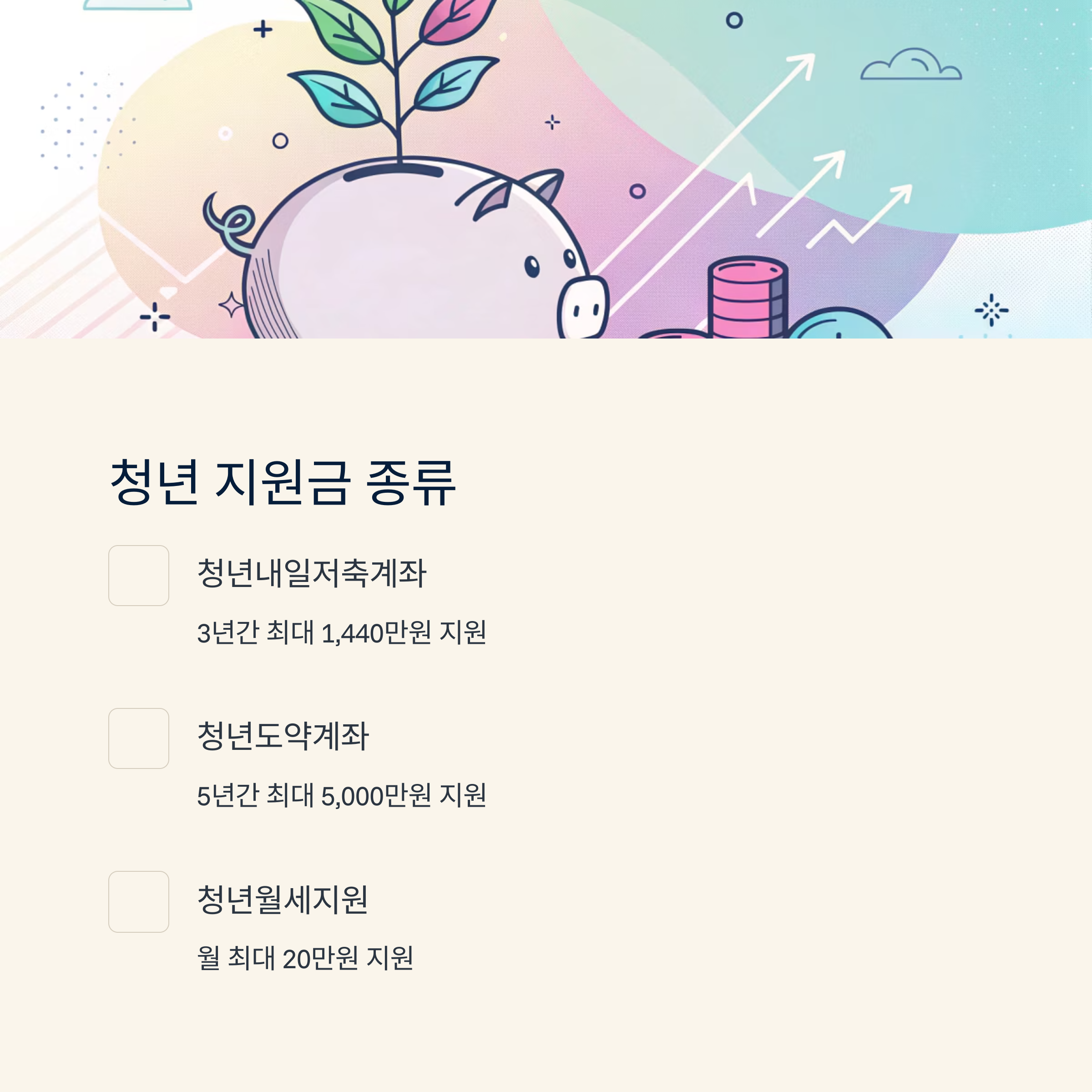 청년 지원금은 정부나 지자체에서 청년들의 자립을 도우려 마련한 대표적인 제도예요. 대표적으로 '청년내일저축계좌', '청년도약계좌', '청년월세지원' 등이 있어요. 각각 지원 대상과 조건이 다르기 때문에 꼼꼼히 확인하고 준비해야 해요.