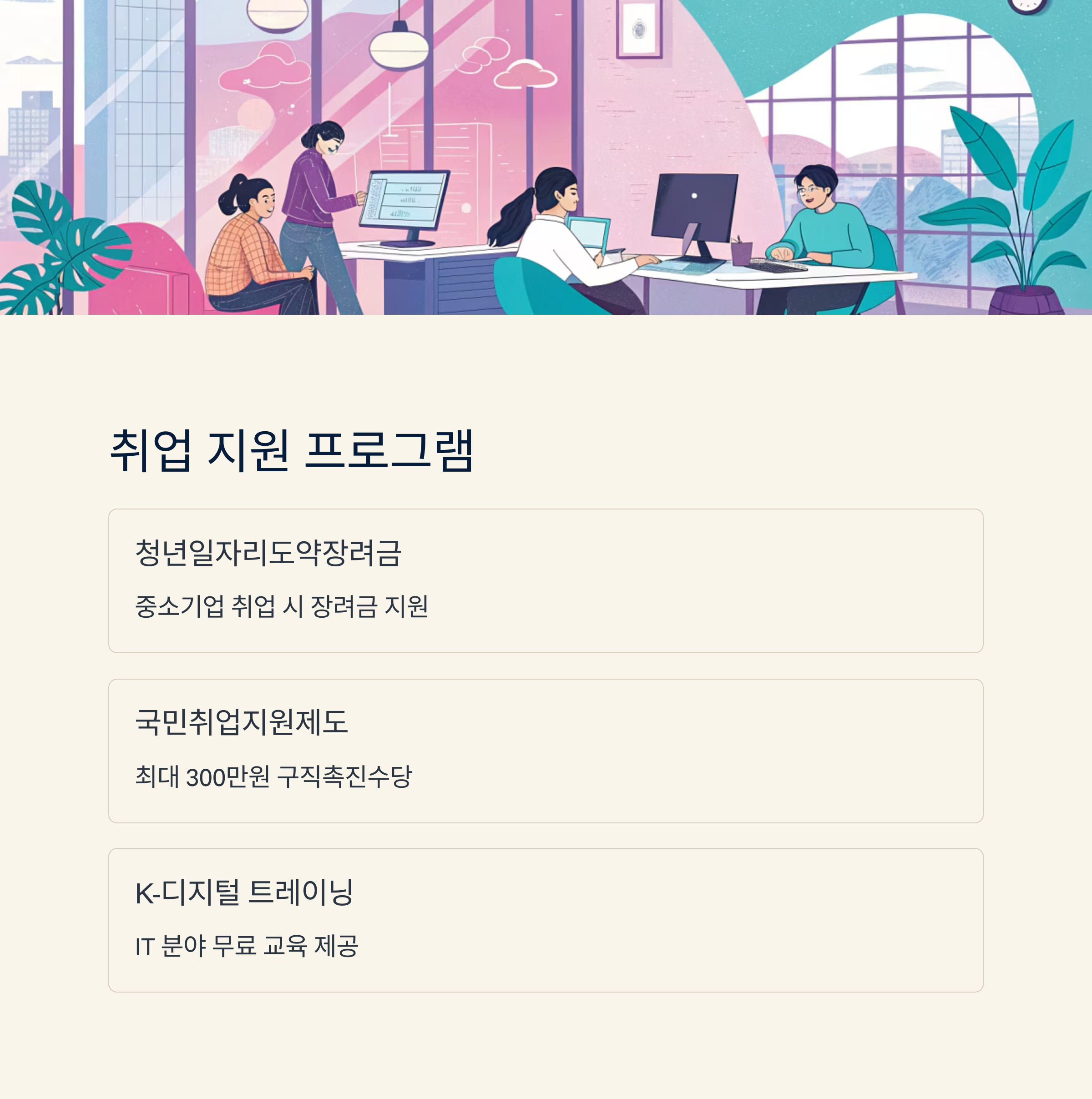 이외에도 '디지털 역량강화 교육', '청년 인턴십' 같은 다양한 과정이 있으니, 워크넷, 청년센터 등을 통해 최신 정보를 수시로 확인해보는 걸 추천해요.