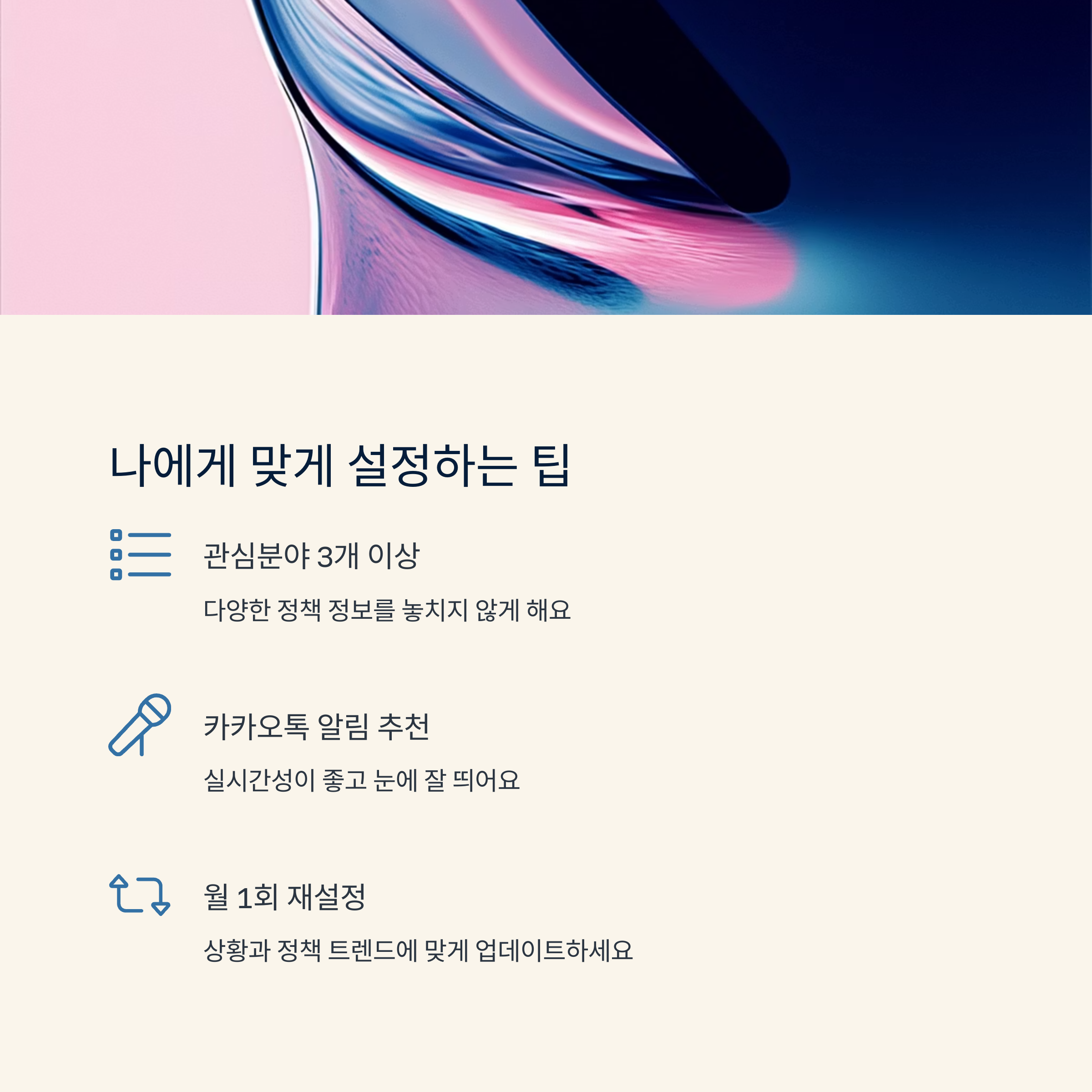 마지막으로, 한 달에 한 번은 관심 분야를 다시 설정해보세요. 나의 상황이 바뀔 수 있고, 정책 트렌드도 변하거든요. 유연하게 활용하면 알림서비스가 더 똑똑해진답니다 🧩