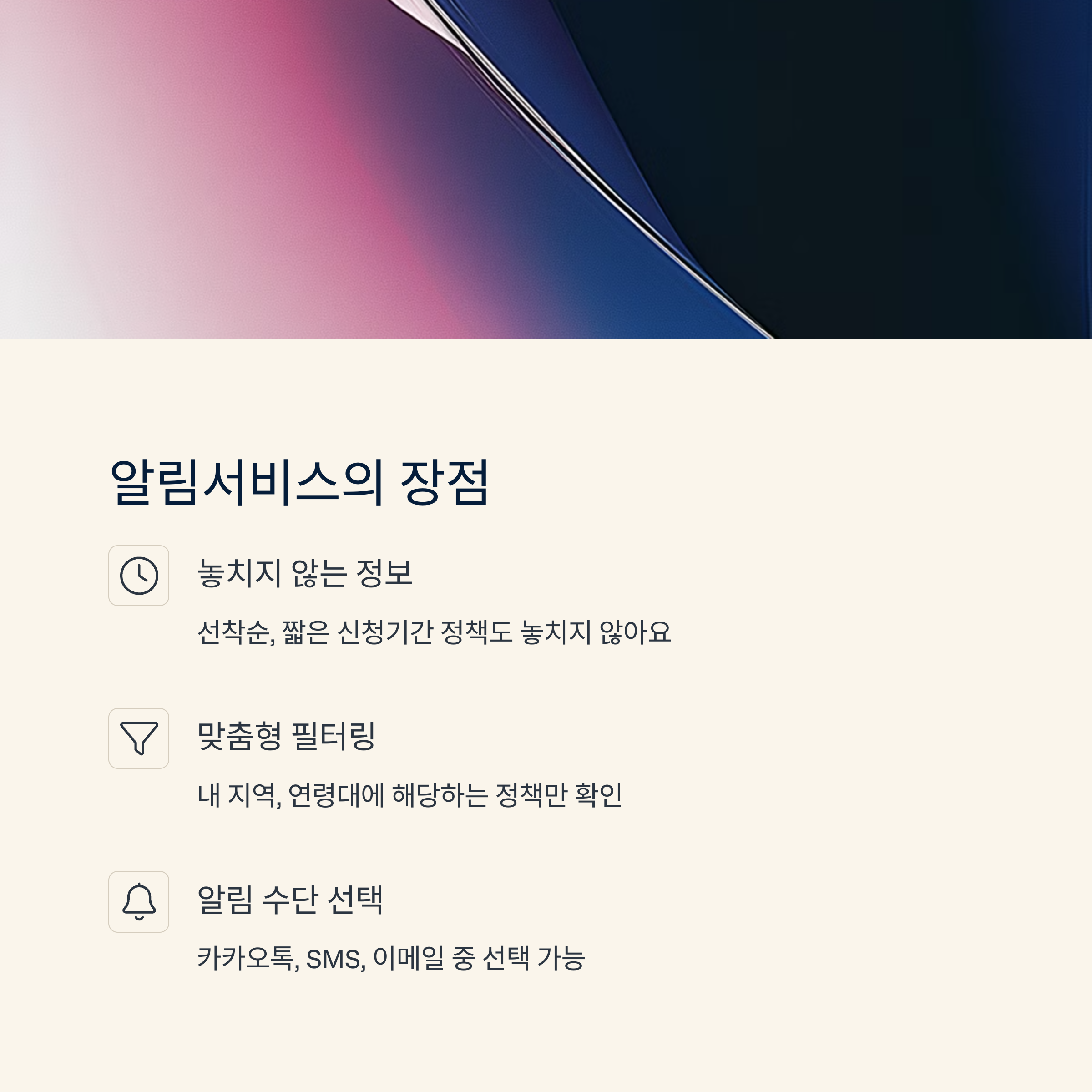 가장 큰 장점은 ‘놓치지 않고 정책 정보를 받을 수 있다’는 점이에요. 나에게 맞는 청년 정책은 종종 신청 기간이 짧고, 선착순 마감인 경우도 많아서 사전 정보가 정말 중요하거든요.