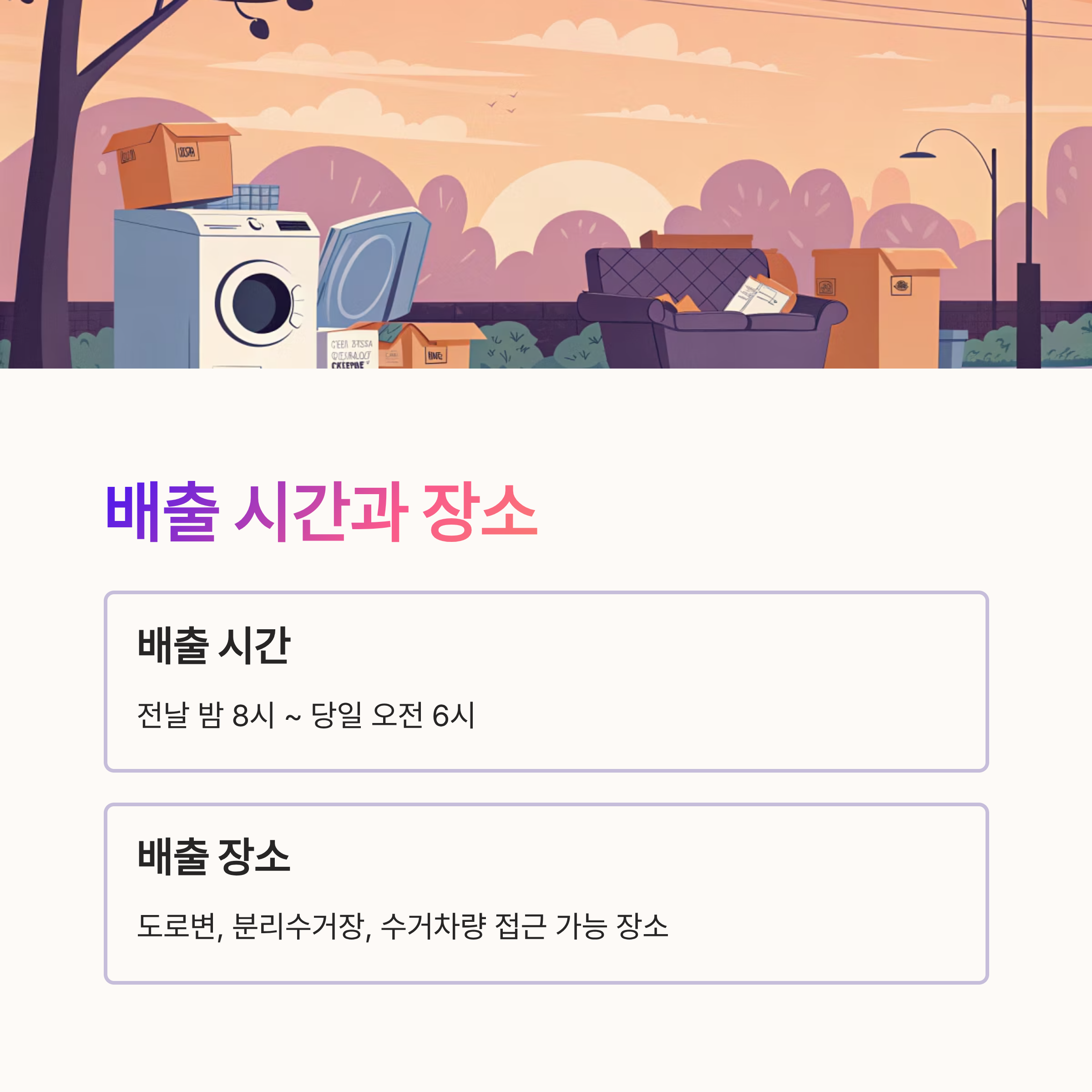 이제 신청도 했고 스티커도 붙였고, 비용도 냈다면 마지막 단계는 수거 일정과 배출 장소를 지정하는 거예요. 🚚 그 내용은 바로 아래에서 확인해요!
