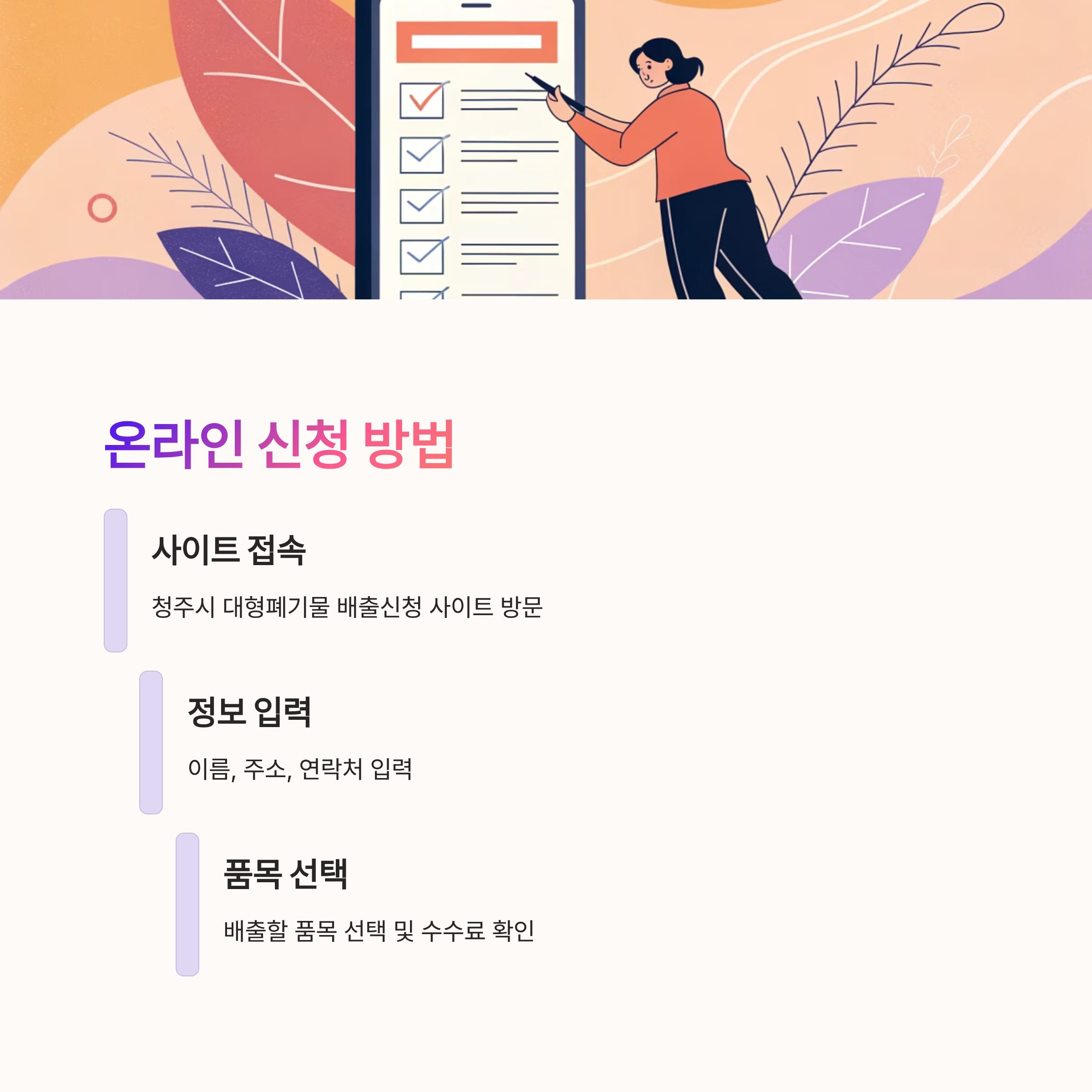 청주 시민이라면 누구나 위 표에 해당하는 물품을 배출할 때 청주시 대형폐기물 배출 시스템을 꼭 이용해야 해요. 이제 신청 방법을 알아볼까요? 📝