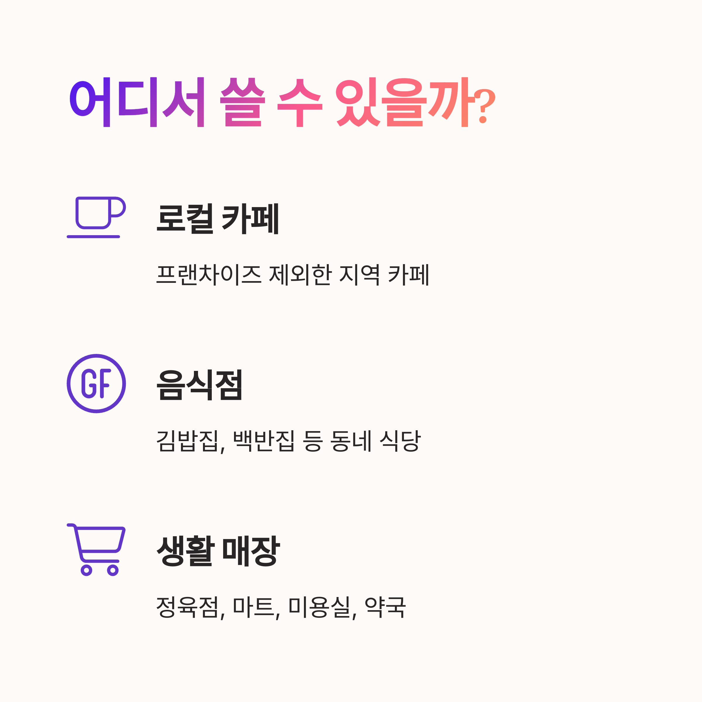 소비 패턴도 자연스럽게 지역 소상공인 위주로 바뀌기 때문에 지역경제에도 긍정적 영향을 주게 돼요. 내 소비가 좋은 영향으로 돌아온다는 뿌듯함도 느낄 수 있죠.