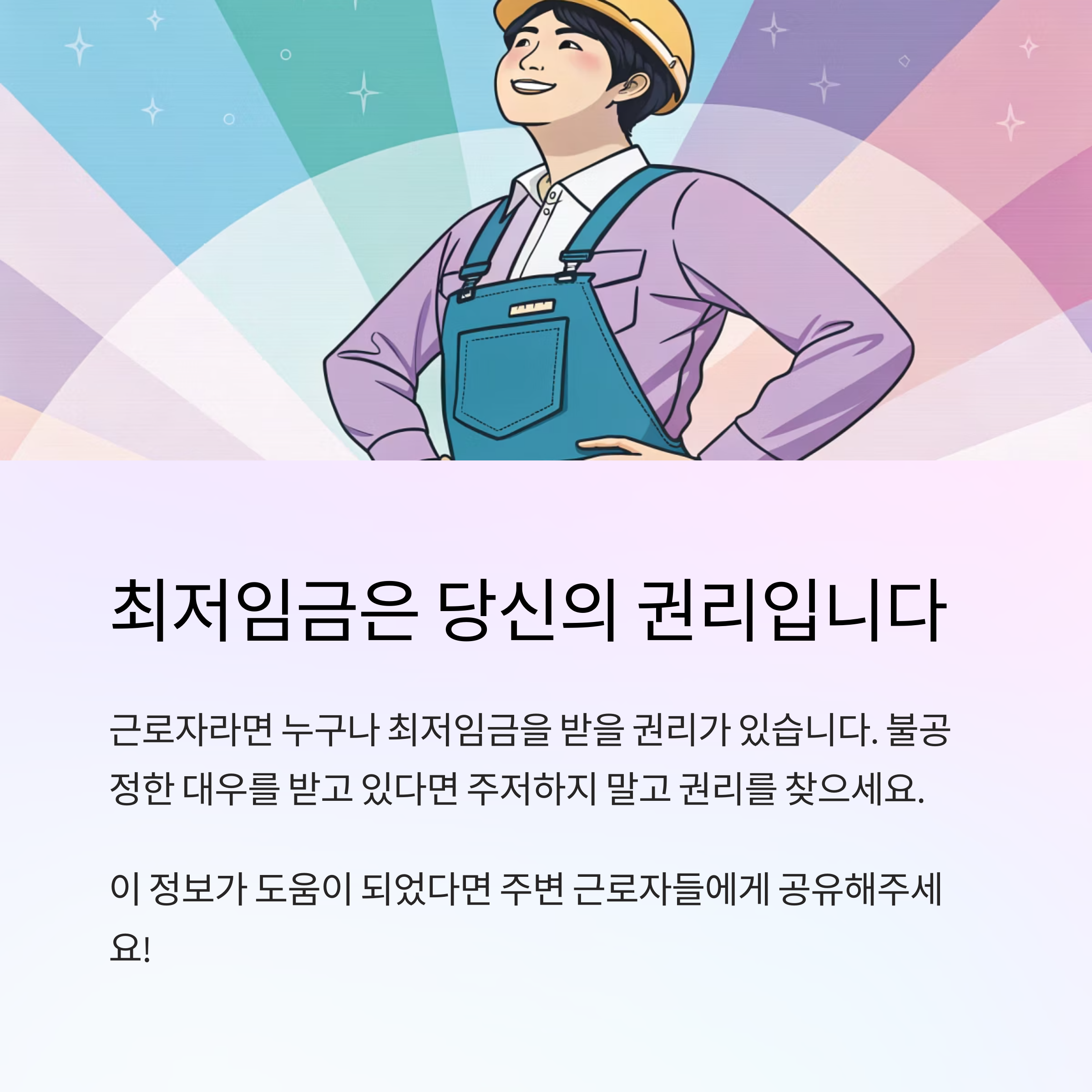 업종마다 겪는 현실은 다르지만, 공통된 사실은 ‘최저임금은 절대적인 기준’이라는 거예요. 어떤 형태의 노동이든 인간다운 삶을 보장하기 위한 장치인 만큼, 정확히 알고 지켜야 한다는 게 핵심이에요.