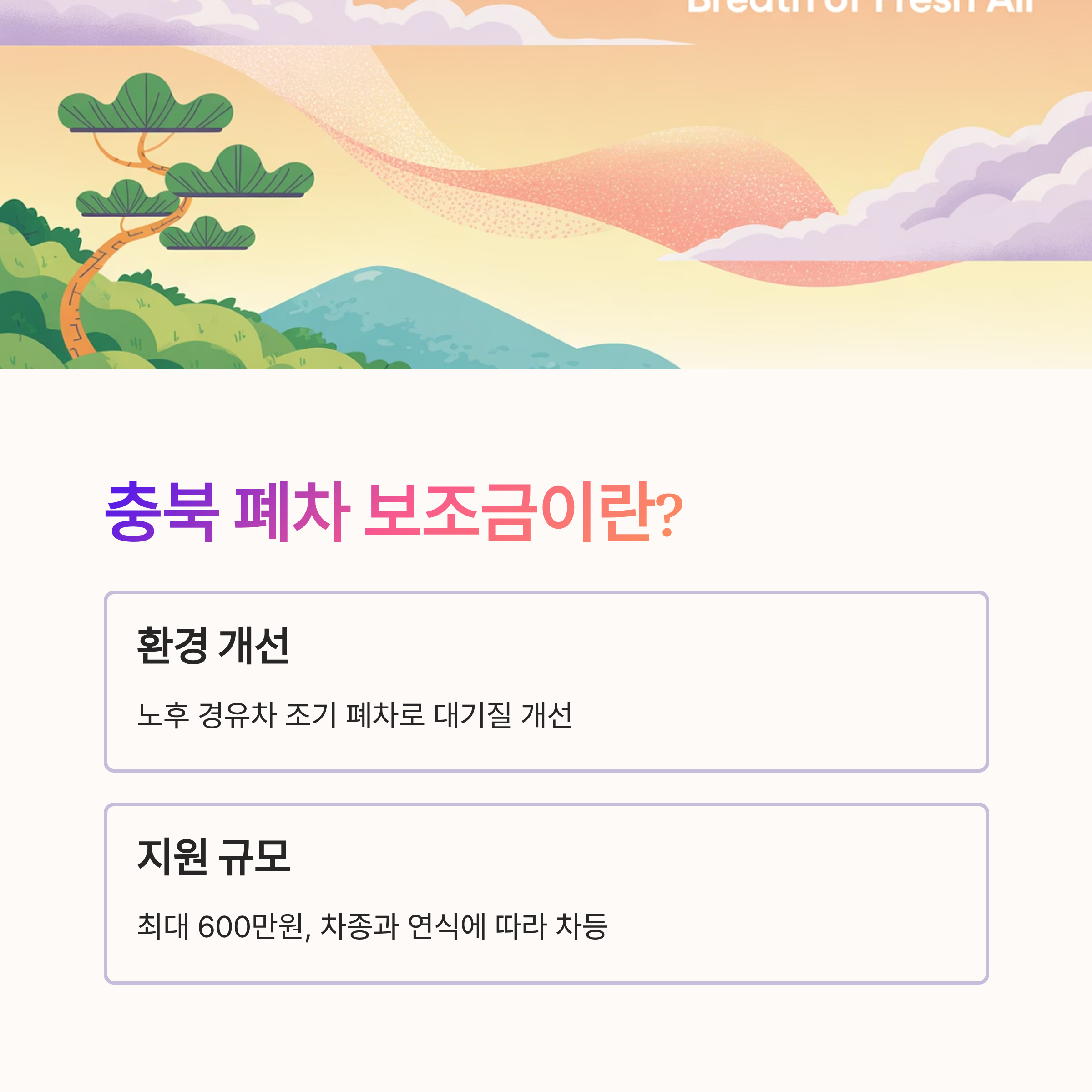 충청북도는 노후 차량으로 인한 대기 오염을 줄이기 위해 '폐차 보조금' 제도를 운영하고 있어요. 이 제도는 차량을 조기에 폐차하면 일정 금액의 보조금을 지급해주는 방식으로, 특히 환경문제에 민감한 요즘 같은 시대에 많은 이들의 관심을 받고 있답니다.