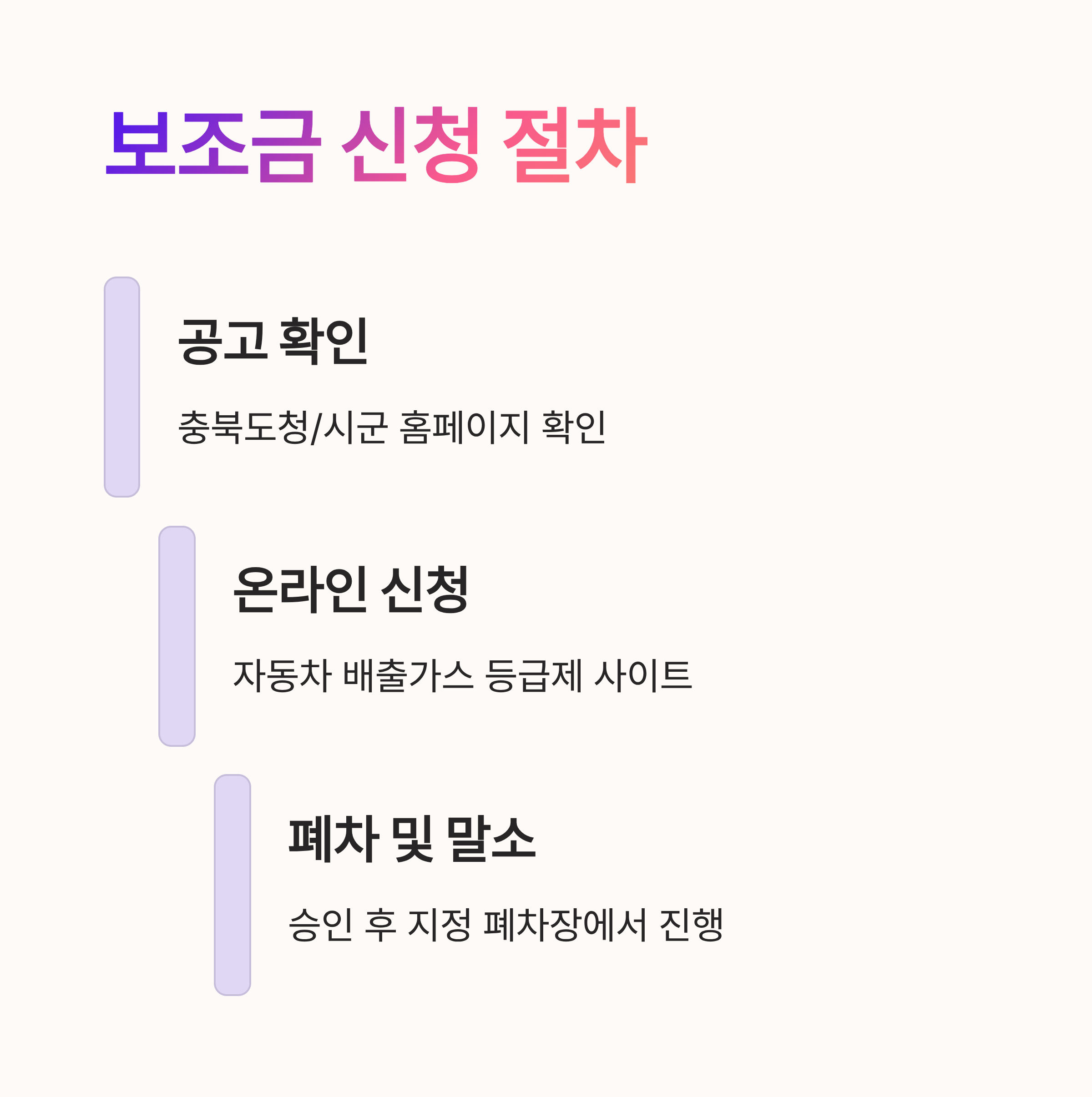 폐차 보조금 신청은 보통 1년에 여러 차례 분할 공고로 진행돼요. 충북도청 또는 해당 시군 홈페이지를 통해 공고가 올라오면 그 일정에 맞춰 온라인 또는 오프라인으로 접수하면 된답니다.