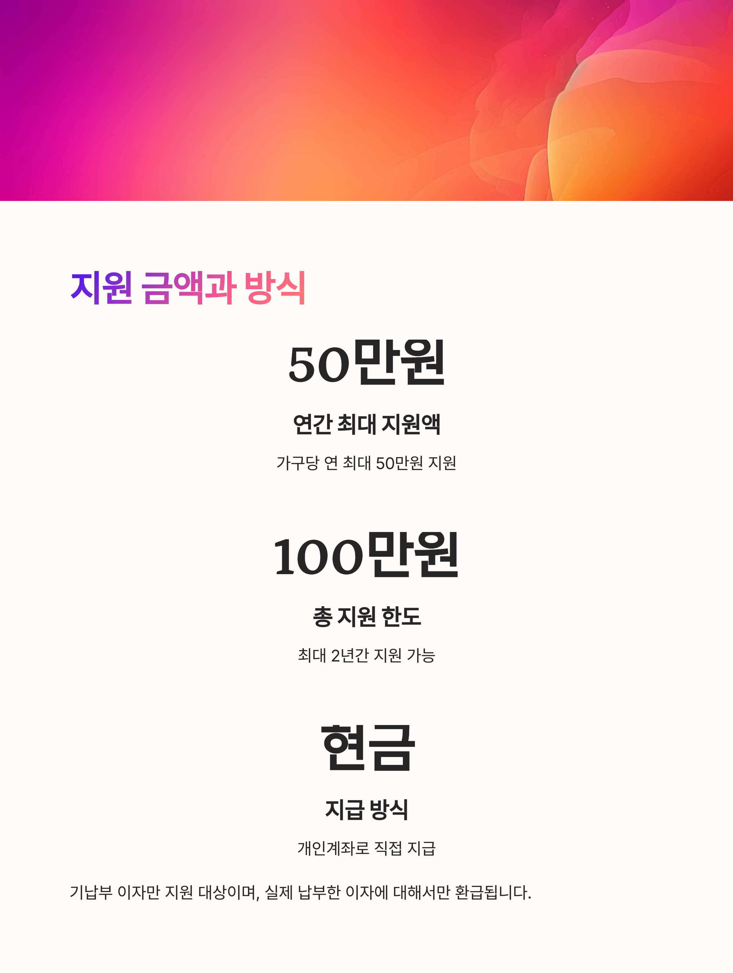 이 사업을 통해 가구당 연 최대 50만 원의 대출이자를 지원받을 수 있어요. 최대 2년간 지원이 가능해서, 총 100만 원까지 도움을 받을 수 있답니다. 이 금액은 개인계좌로 직접 현금으로 지급돼요.