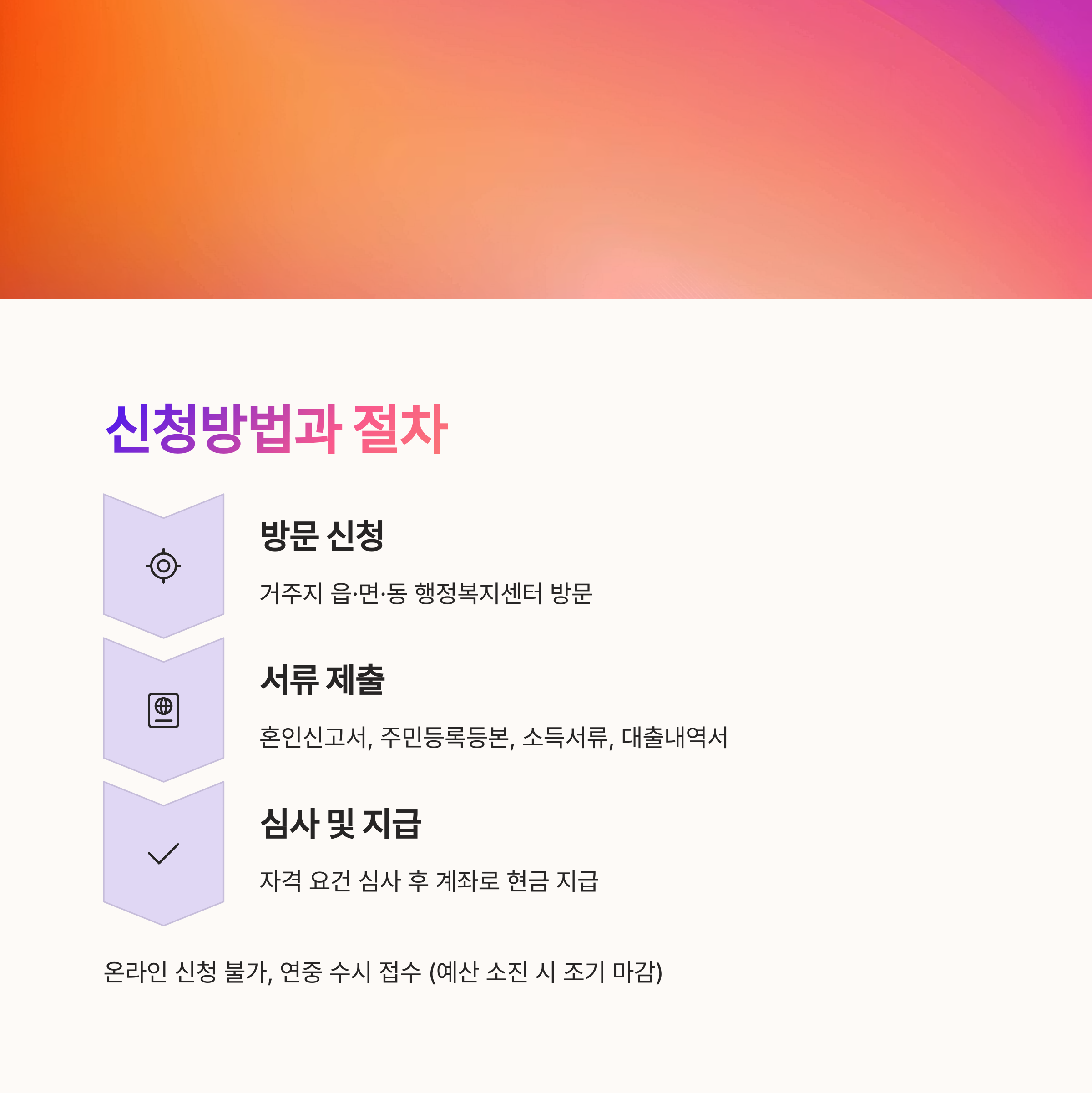 혼인신고, 주민등록등본, 소득서류, 대출내역서 등 서류를 미리 준비하면 빠르게 접수할 수 있답니다.